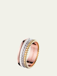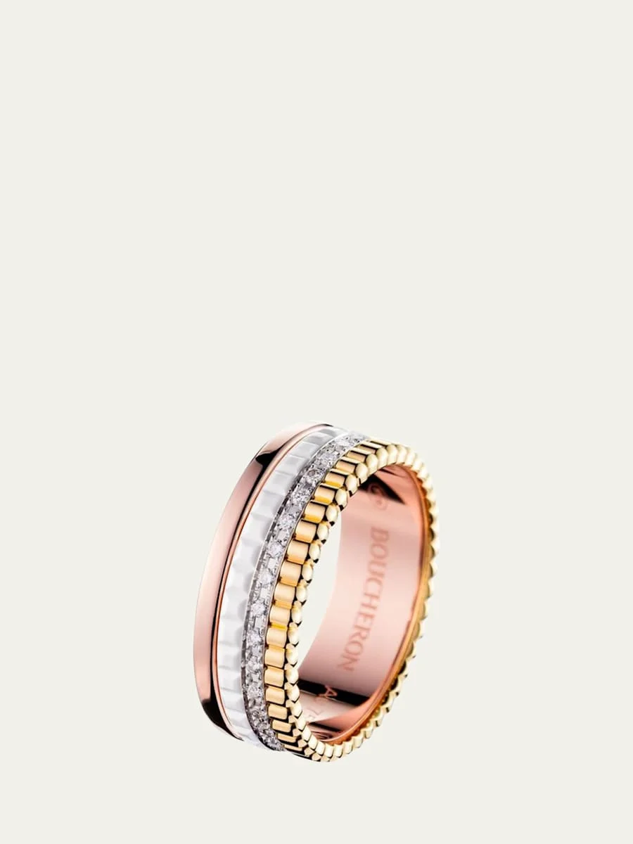 Boucheron ring in tricolor gold. 18-karat yellow, white and pink gold. White diamonds and HyCeram® ceramic. 0.24 total diamond carat weight. Made in Switzerland. Online Inquiries: BGS21_PCBBV| Store Inquiries: #4109830