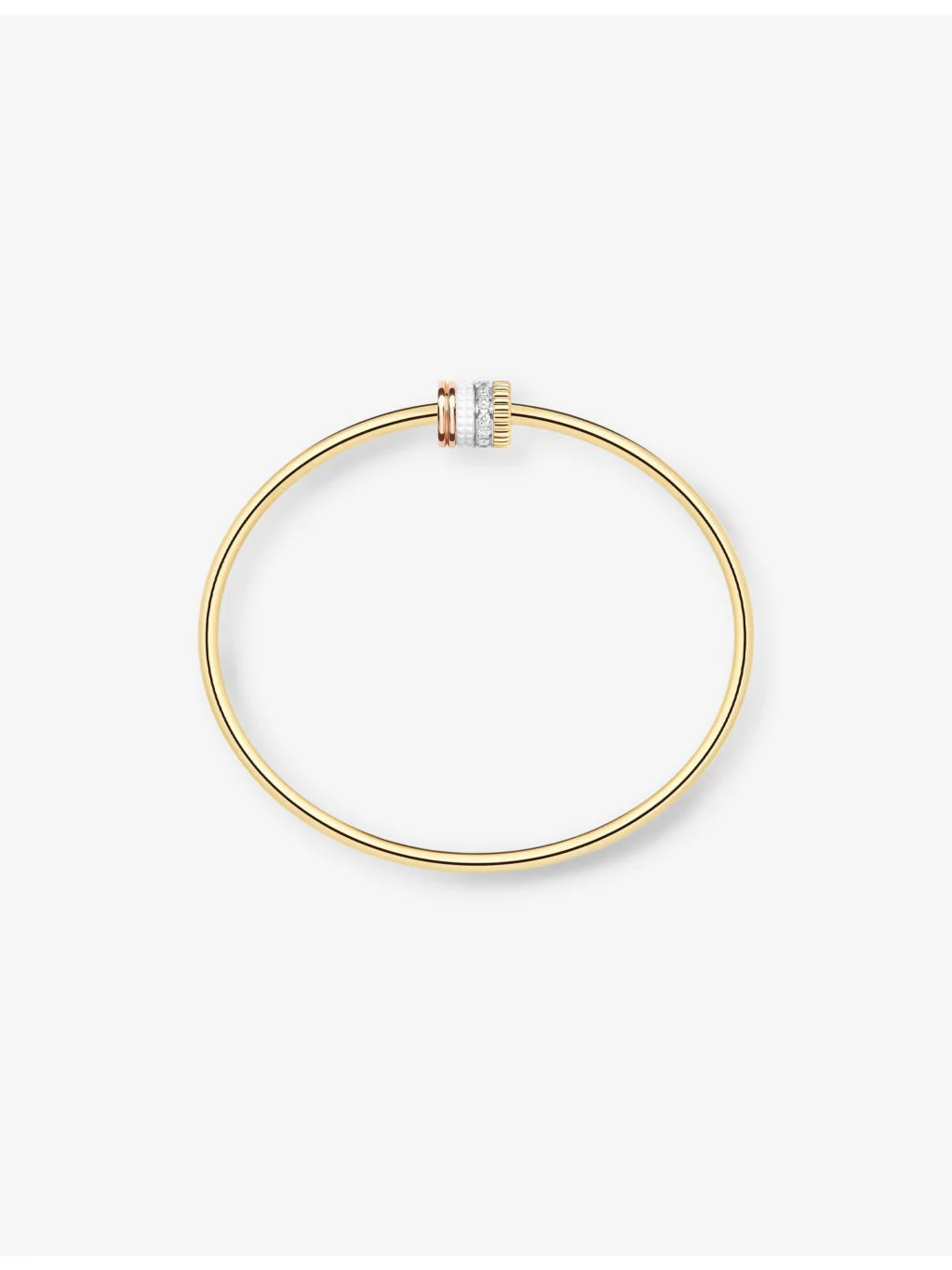 PRODUCT DETAILS - Boucheron Quatre white-edition 18ct yellow and rose-gold, 0.11ct diamond and ceramic bracelet - 100% 18ct yellow gold, 100% 18ct rose gold - 11 diamonds - Slips on - Polished finish, grosgrain pattern, white edition - Carat: 0.11ct - Cut: round - Clarity: FL-VS2 - Colour: D-G - Dimension: motif diameter 7.6mm, length 8.3mm - Made in Italy - Wipe it with a dry, clean cloth - Presented in a Boucheron box. This product comes with a Boucheron certificate of authenticity Ref: R04313105
