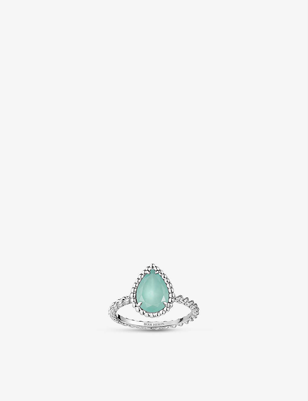 PRODUCT DETAILS - S motif corresponds to 13 mm - Boucheron 18ct white-gold and 1.16ct aquaprase ring - 18ct white gold - One aquaprase totalling 1.16ct - Slips on - Twisted rope band, single stone, beaded detailing, polished finish - Carat weight: 1.16 - Carat cut: pear - Motif height: 13mm - Please use a soft, dry polishing cloth - Made in Switzerland Ref: R03786144