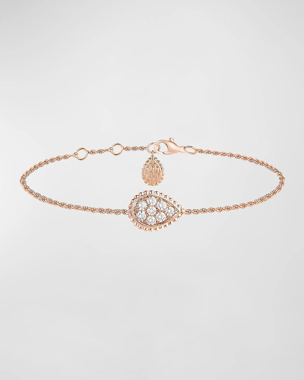 - The art of the Magician of Stones consists in accentuating the brilliance of the stones by using the grain setting technique: the head of the serpent is highlighted and magnified. The dazzle of this line is enhanced by the delicate gold beads that surround them. All of this magic is reflected in the Serpent Boheme bracelet. - Boucheron bracelet - Approx. 7" length - 18-karat rose gold - Eight round diamonds - 0.33 total carat weight - Adjustable length - Lobster clasp - To clean or shine this piece, wipe with a clean, dry cloth. - Made in Italy - Boucheron Style # JBT00602