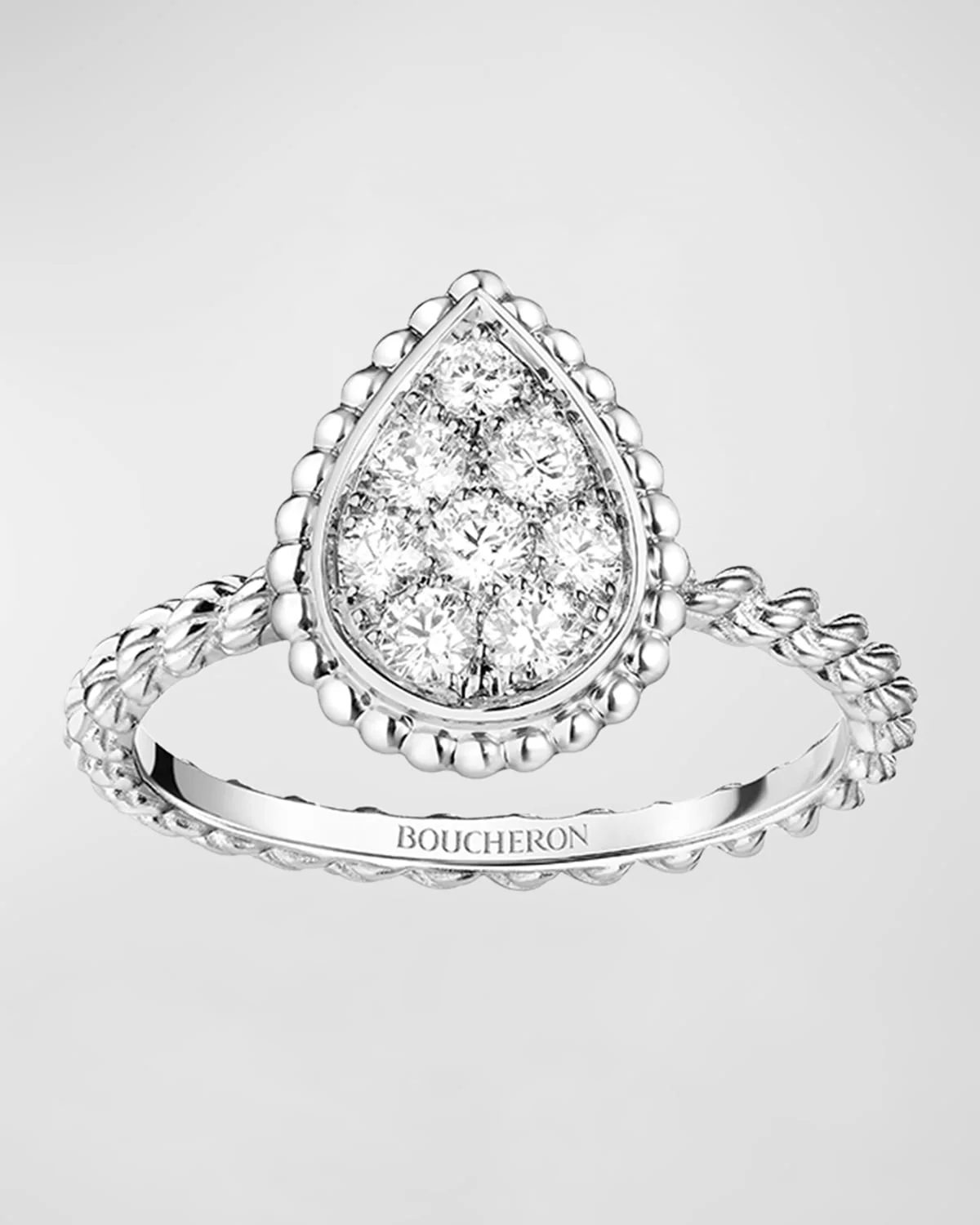 - In white gold and paved with diamonds, this version is more streamlined but no less feminine or sensuous. If you are familiar with the Serpent Boheme collection, you know you’ll assert your unique personality when you dress this versatile piece up or down. With ear studs, a bracelet or a necklace? You decide. - Boucheron ring in 18-karat white gold - Approx. 0.74"L x 0.48"W x 0.85""H - Round white diamonds - Total carat weight: 0.32 - To clean or shine this piece, wipe with a clean, dry cloth. - Made in Italy - Boucheron Style # JRG02148
