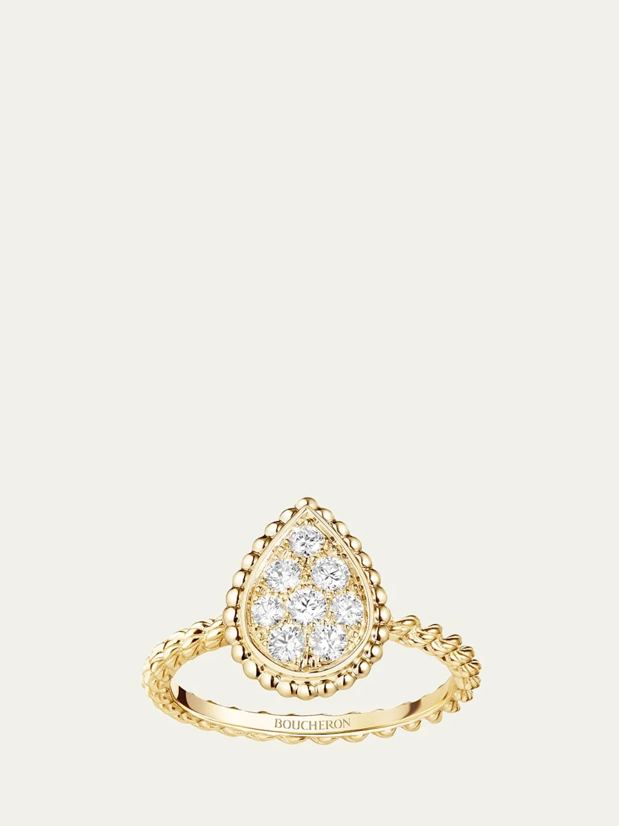 Yellow gold brings out the collection’s streamlined aesthetic. The Serpent Boheme ring takes inspiration from one of the collection’s iconic codes: the twisted chain. With its exquisite finesse, the ring brings out your sparkle by day and by night. It may be worn on any occasion, on its own or with other creations from the collection, whether in yellow, white or pink gold. Boucheron ring Polished 18-karat yellow gold Eight round white diamonds 0.32 total diamond carat weight Made in Switzerland Boucheron style #JRG02144 Online Inquiries: BGS21_PMCLQ| Store Inquiries: #4967140