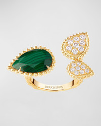 - Contrasting yellow gold and malachite enhance the femininity of this triple-motif Serpent Boheme ring. It is said to have protective virtues. Is that why you are choosing it? - Boucheron three-motif ring - 18-karat yellow gold - Pear-cut malachite - Round-cut diamonds - Total diamond carat weight: 0.46 - Total malachite carat weight: 0.80 - To clean or shine this piece, wipe with a clean, dry cloth. - Made in Italy - Boucheron Style # JRG03026