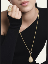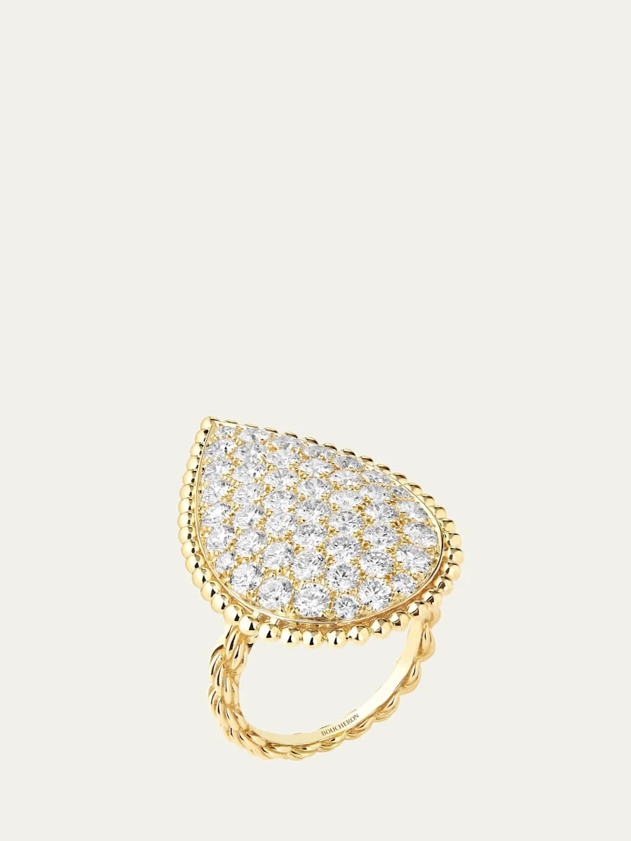 Boucheron "Serpent Boheme" ring adorned with a bold oversized drop paved with diamonds Its unique brilliance comes from the honeycomb pattern on the back of the drop, which allows light to seep through and illuminate the diamonds. The gold delicately twisted around the finger adds character to the iconic ring 18-karat yellow gold 46 round diamonds Total diamond carat weight: 3.58 Made in Italy Online Inquiries: BGS21_PMCM2| Store Inquiries: #4967156