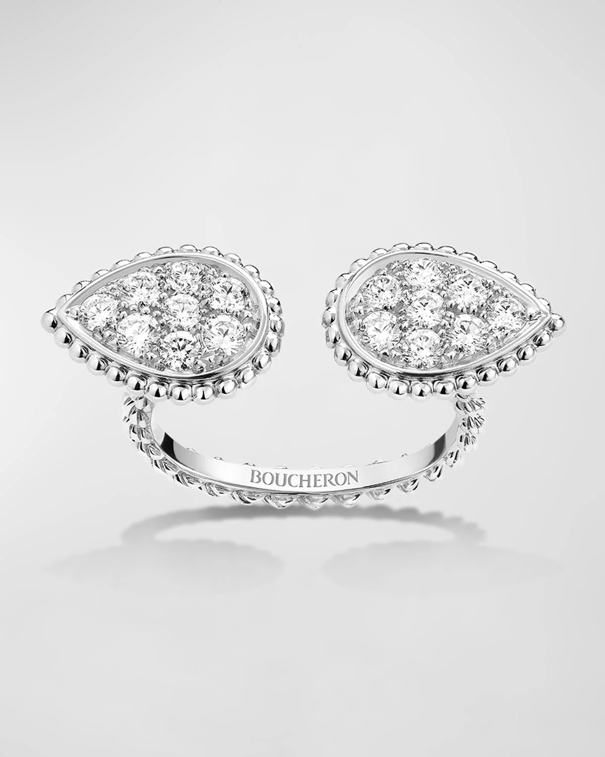 - With this ring, be gentle, but be yourself. Wear it alone or together with its single motif little sisters, bring a chic touch to an extravagant wardrobe, and spice up your life. - Boucheron ring - 18-karat white gold - 16 round white diamonds - 0.67 total diamond carat weight - Runs small; we recommend ordering 1 size up. - Wipe with a clean, dry cloth - Made in France - Boucheron Style # JRG02995