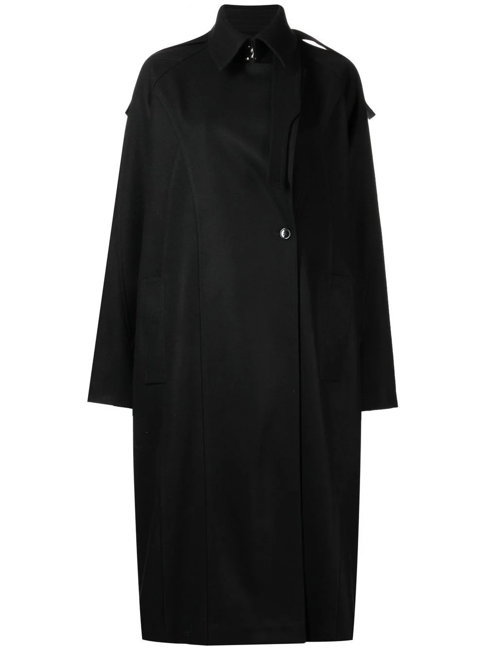 Pasta trench coat black wool blend off-centre front button fastening epaulettes long sleeves classic collar Imported Composition Body: Wool 75%, Polyamide 20%, Cashmere 5% SIZE & FIT Model measurements Height 5 ft 9 in(1.76 m) Bust/Chest 29.92 in(76 cm) Hips 35.82 in(91 cm) Waist 25.98 in(66 cm)