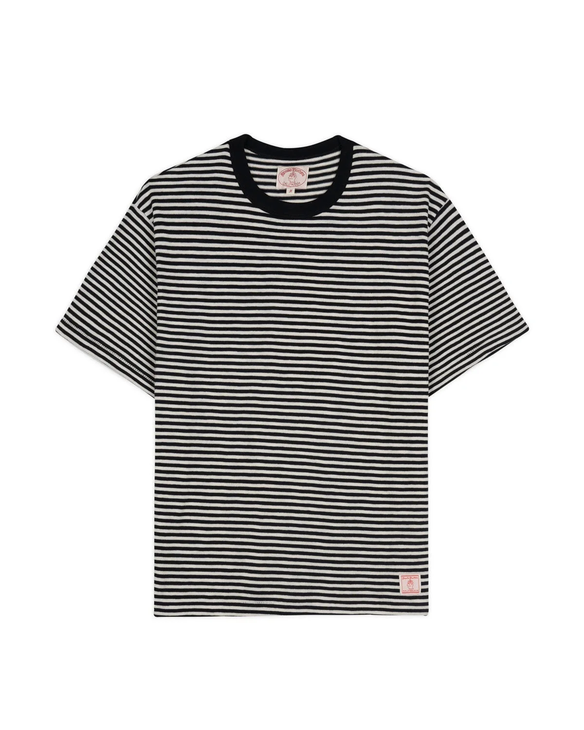 DETAILS Our loose knit striped short sleeve T-Shirt with Brooks Brothers. Features single needle stitched seams. Material: 100% Cotton Color: Black BROOKS BROTHERS CALIFORNIA is our take on the idea that this historical brand was not just about suits and shirts, but about the American dream of innovation and creativity. BROOKS BROTHERS CALIFORNIA is not just a repro of Ivy Style, but an attempt to break tradition, adding personal identity to the classic American style.