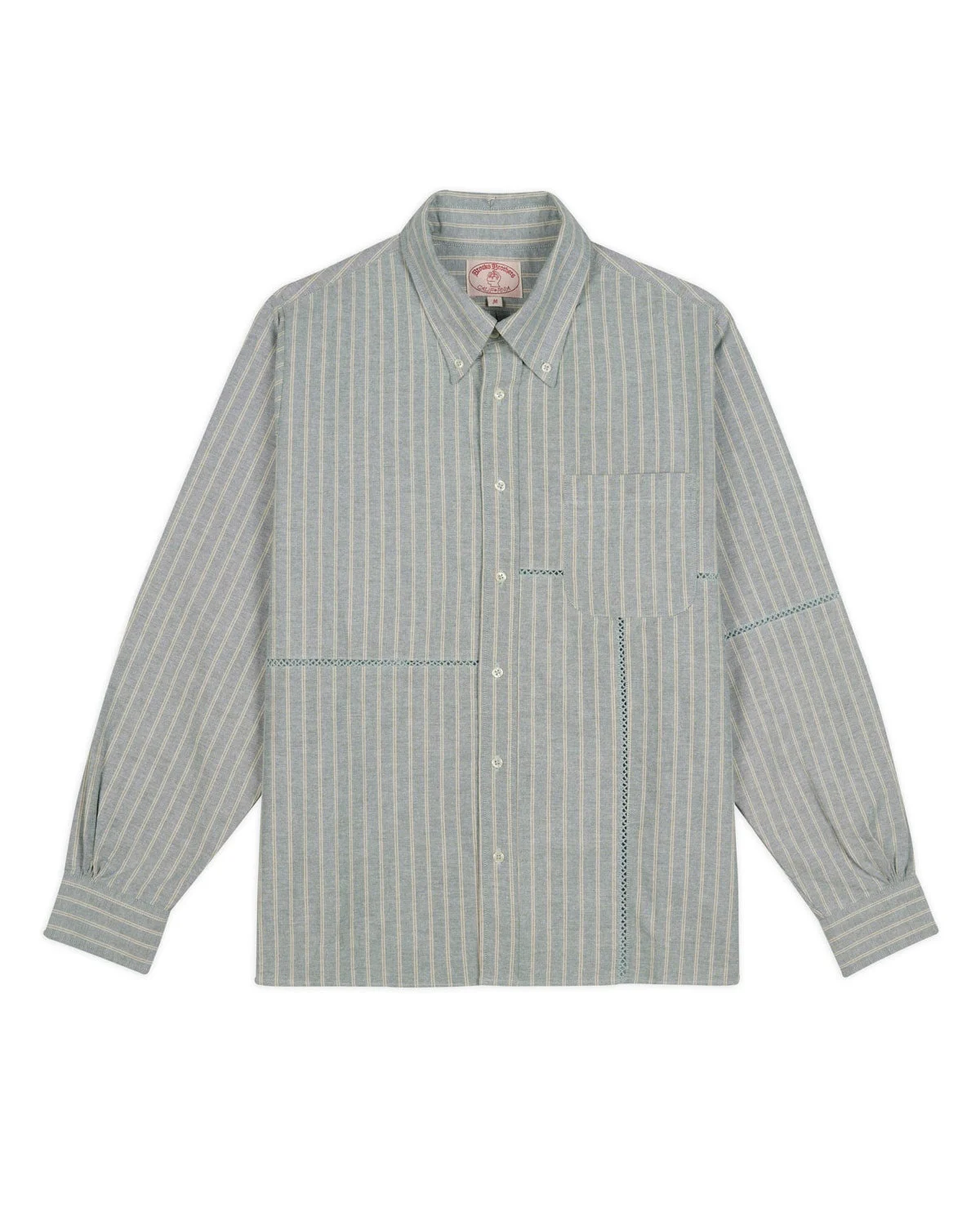 DETAILS Our striped oxford button up with Brooks Brothers. Features the signature Brooks Brothers collar and cuffs, and chainstitch embroidery on the front. Fabric sourced from Japan. Material: 100% Cotton Color: Green BROOKS BROTHERS CALIFORNIA is our take on the idea that this historical brand was not just about suits and shirts, but about the American dream of innovation and creativity. BROOKS BROTHERS CALIFORNIA is not just a repro of Ivy Style, but an attempt to break tradition, adding personal identity to the classic American style.