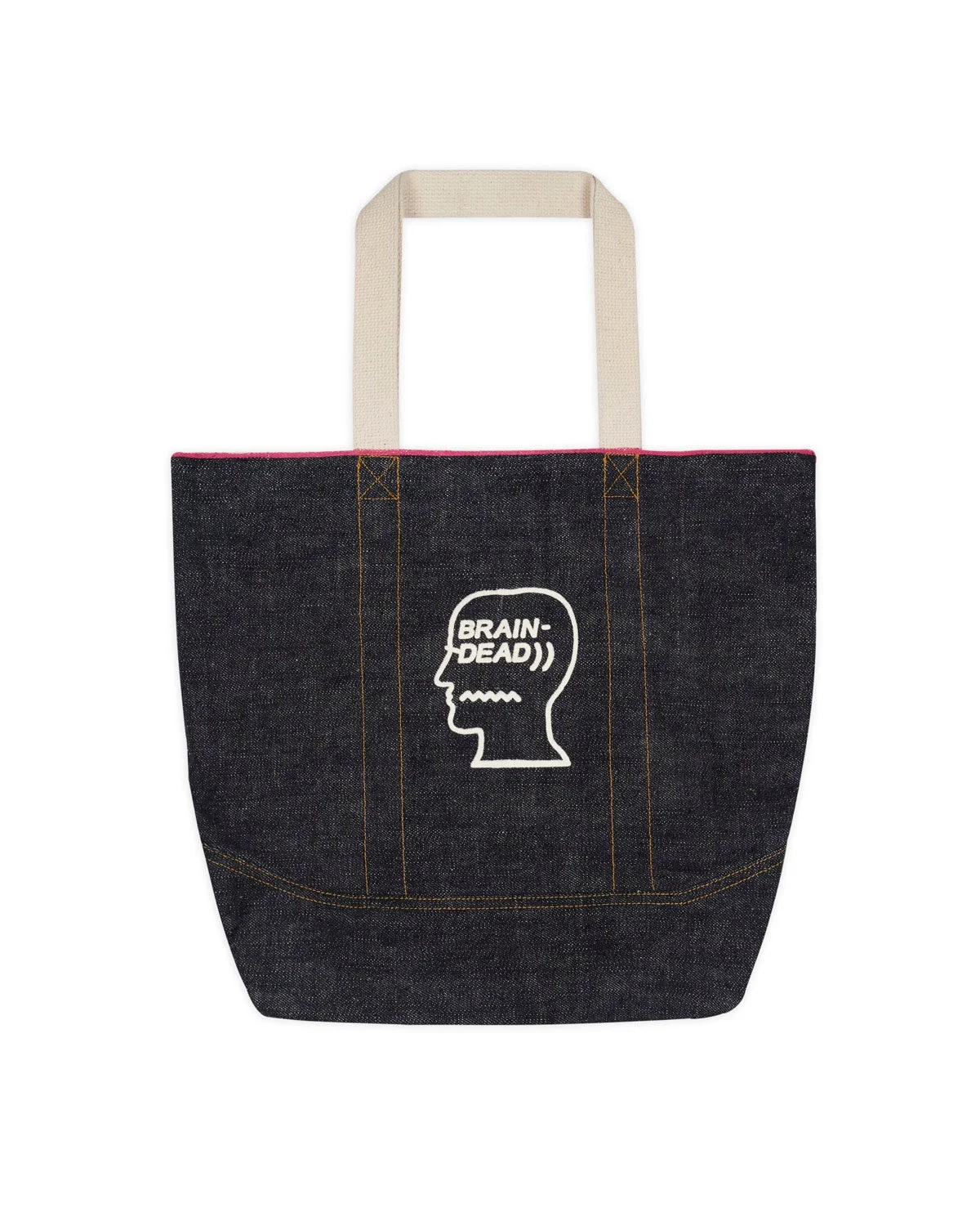 DETAILS Our Japanese selvedge denim tote bag in indigo. Features logohead graphic on one side and pink selvedge line at the opening. Note: This tote is made from raw denim - to minimize shrinking, hand wash in cold water and line dry. Dimensions: 18.5" x 13" Material: 100% Cotton Color: Indigo