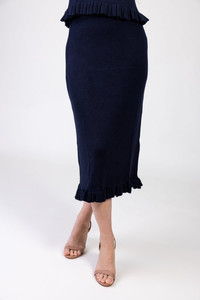 DETAILS AND INSIGHT Brandon Maxwell the grace skirt in navy. 100% CASHMERE DRY CLEAN Made in Nepal Style KN428PS25-NAVY