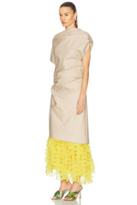 Details - Self 1: 100% cotton - Self 2: 100% silk - Self 3: 100% polyester - Dry clean only - Lined with optional slip - Hidden back and side zipper closures - Twill fabric with ruching detail - Optional contrast slip with 3D petal embellishment - Made in US - Our Style No. BMAX-WD103 - Manufacturer Style No. DR751SS25-B