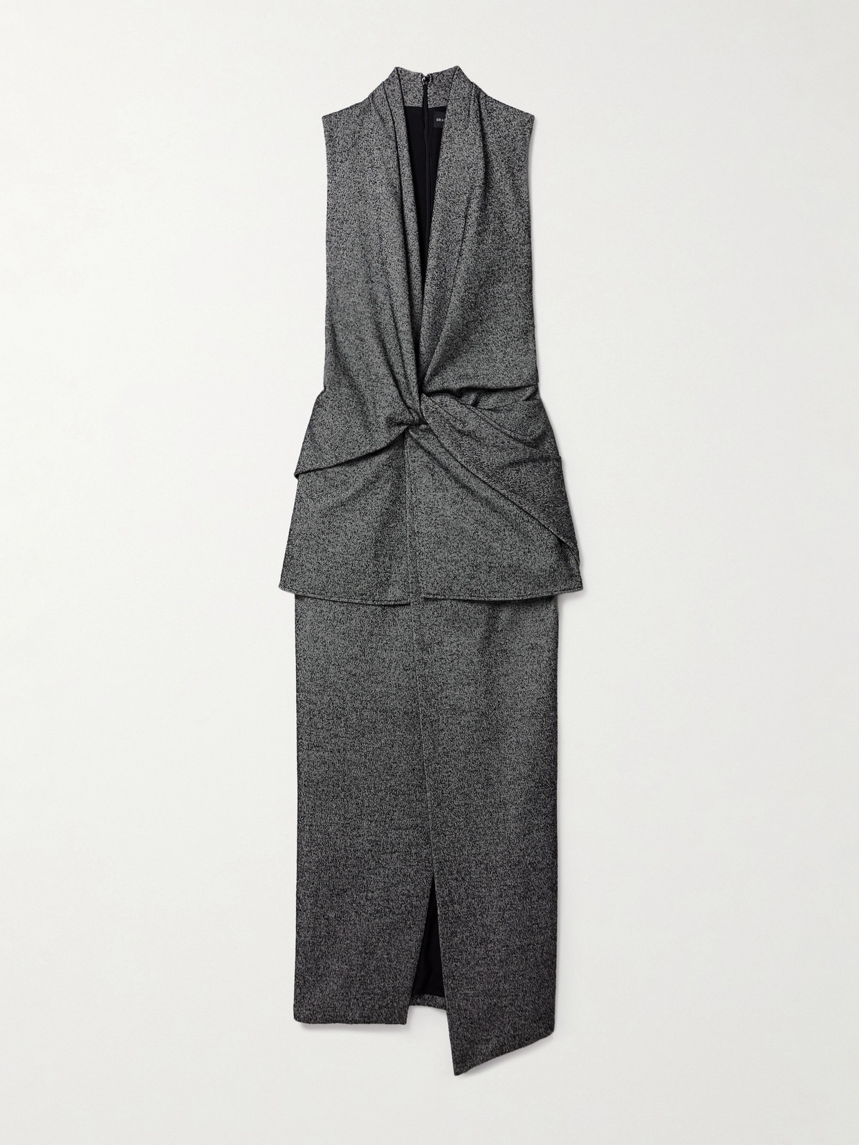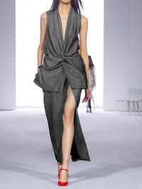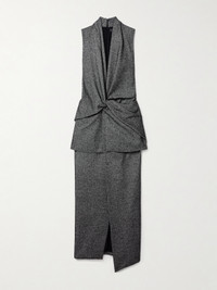 Brandon Maxwell's 'The Margo' dress is artfully gathered and layered at the waist to create the illusion of separates. It's made from wool-blend and has a wrap-effect skirt with a thigh-grazing split. Mirror the Fall '24 runway and style yours with colorful pumps.