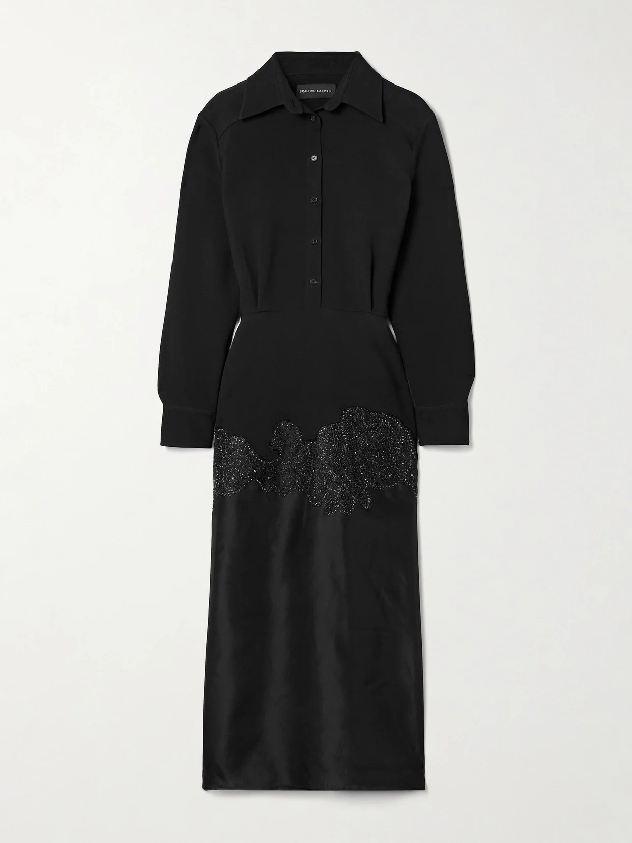 Brandon Maxwell's Resort '25 collection is all about the small, considered details that make a garment feel special. As seen in the lookbook, this 'The Amelie' shirt dress has a wool-blend crepe bodice and silk-organza midi skirt, connected via an ornate crystal-embellished panel. Undo a few buttons for a relaxed feel.