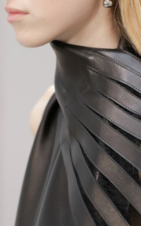 PRODUCT DETAILS - Regular fit, sleeveless, scarf-detailed neck, side slit pockets, strip embroidery skirt - Zipper fastening - Lined - Composition: 100% Cow Leather - Color: black - Dry Clean - Fall '25