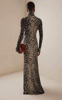 Brandon Maxwell continues to reinvent sophisticated staples this season, as always in a timeless yet contemporary manner. The ‘Camille’ covers the frame in finely knit cashmere. The sleek profile is woven to a slim fit with a high roll neck and train hem. Complement the animal print with a tonal leather handbag and silver accessories. PRODUCT DETAILS - Fall/Winter ‘25 - Slip on - Composition: 100% cashmere - Dry clean - Designer Color: Snow Leopard - Imported