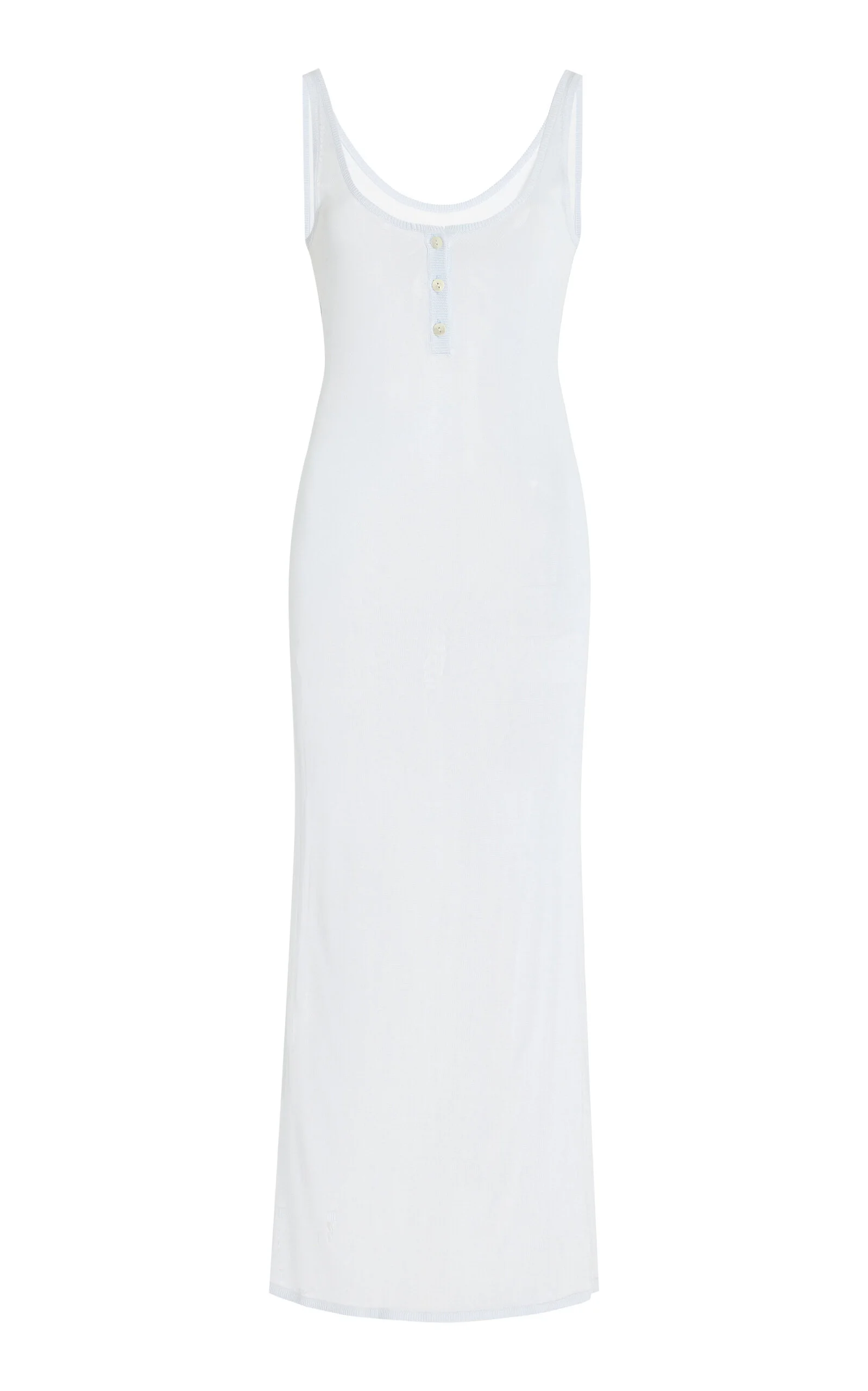 Brandon Maxwell’s proposition for the Spring ’25 collection: to foster a feeling of calm and confident nonchalance. Made from a fine knit, this midi has a simple tank silhouette with a henley neck. PRODUCT DETAILS - Spring '25 - Please note: Additional pieces are for styling purposes only - Slip on - Composition: 100% viscose - Dry clean only - Imported SIZE & FIT - Our model is wearing a size Small - Model is 5'10" with a 31" bust, 23.5" waist, and 33.5" hip - Designed for a regular fit