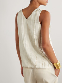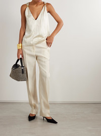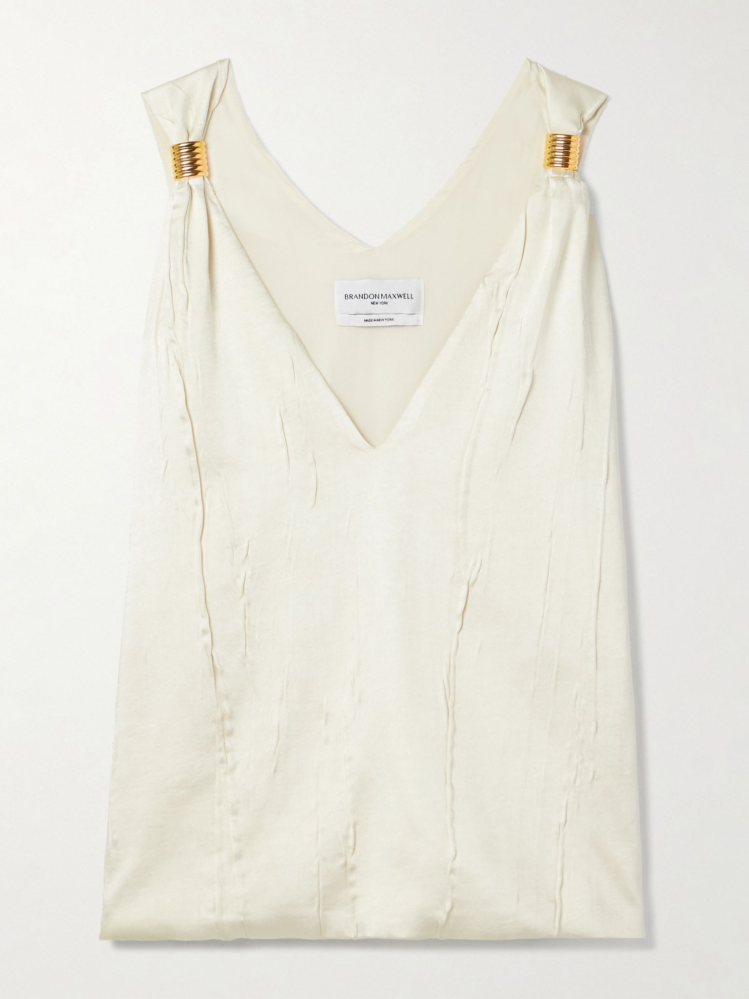 Brandon Maxwell's 'The Drew' tank is punctuated with gold-tone rings at the straps, giving it an elevated look. Designed with a plunging V-neckline, it's cut from crinkled-satin that has a unique textured finish. Size & Fit - Fits true to size, however those who are between sizes should take the smaller size - Cut for a slightly loose fit - Mid-weight, non-stretchy fabric - Model is 180cm/ 5'11" and is wearing a US 2 Details & Care - Ivory crinkled-satin - Slips on - 100% polyester