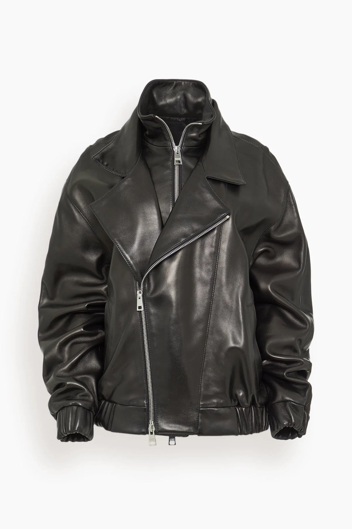 Cut from supple lamb leather, the Brandon Maxwell The Emmett Double Zip Leather Moto Jacket in Black redefines the classic moto silhouette with a modern, sculptural edge. Strong lapels and exposed two-way zippers add industrial sharpness and versatile styling options, balanced by the soft drape and natural sheen of the leather. Elasticated hems at the cuffs and waist lend subtle structure, while meticulous topstitching highlights its craftsmanship. Both refined and enduring, it’s designed to live in your wardrobe forever. FIT DESCRIPTION MODEL MEASUREMENTS - Oversized fit; take your normal size for the designed fit - 2 two-way separating zippers with signature branded pullers - Two side welt pockets - Elastic hem and sleeve cuffs in Japanese stretch - All seams topstitched for detail and durability - 100% Lamb Leather - Charley is wearing a size XS - Bust: 33” - Waist: 25” - Hips: 34” - Height: 5’8”