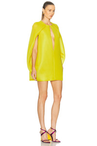 Details - Self: 90.3% polyester, 9.7% spandex - Lining: 100% silk - Dry clean only - Fully lined - Front button loop closure - Front plunging cut-out - Sleeve-cut-outs with draped cape overlay - Midweight organza fabric - Made in US - Our Style No. BMAX-WD110 - Manufacturer Style No. DR748SS25