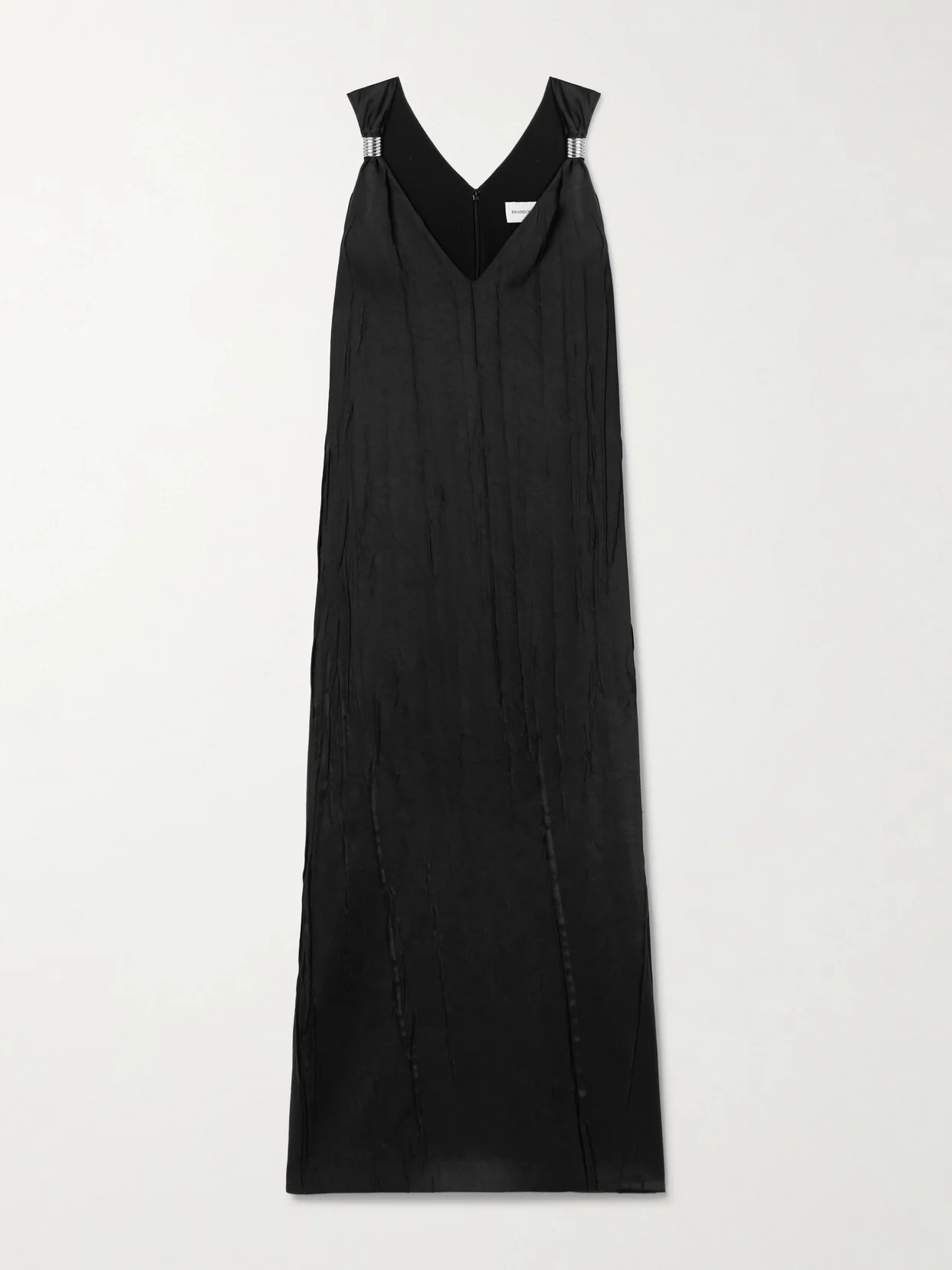 Brandon Maxwell's ‘The Keke' dress proves that the smallest details make an impact. It's cut from lustrous satin that's intentionally crinkled and has a V-neckline framed by silver-tone embellishments on either side. Accessorize with strappy sandals and a clutch.