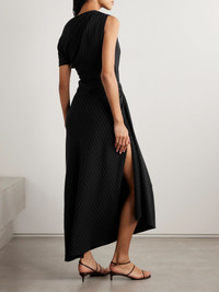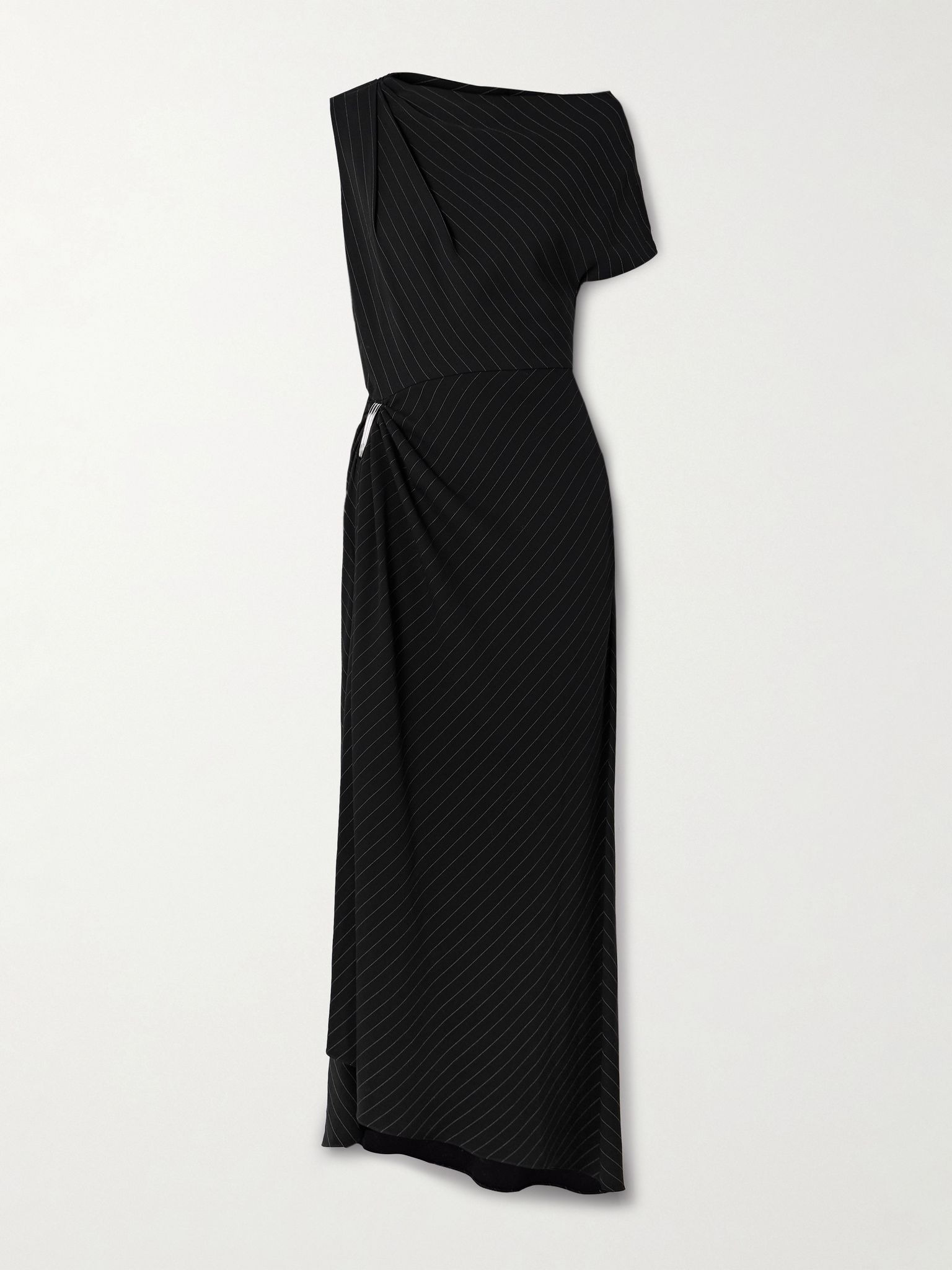 The Lowery one-sleeve asymmetric embellished pinstriped twill dress Black