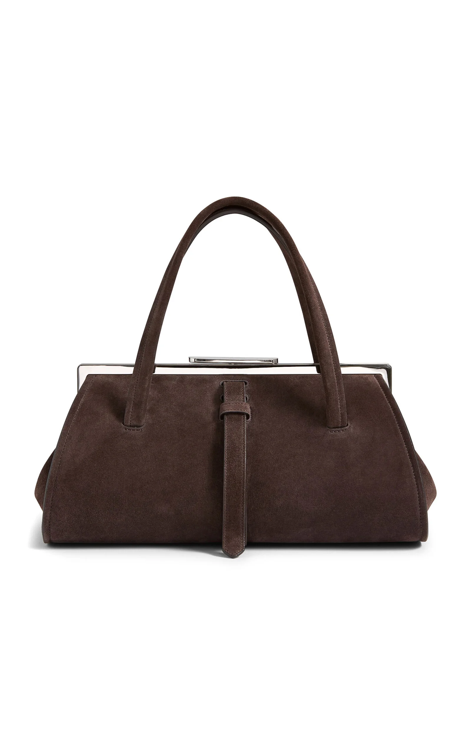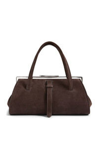 Handcrafted in Italy from rich malt brown suede, the Maxwell Bag is defined by its custom frame construction and architectural silhouette. Palladium-plated hardware and teardrop-shaped gussets refine the design, while the handles offer versatile styling. Designed to rest comfortably on the shoulder, slip into the crook of the elbow, or carry in hand, it is created as an instant hero and imagined to become a timeless staple in your wardrobe for years to come. PRODUCT DETAILS - Handcrafted in Italy - Suede exterior with leather handles - Palladium-plated hardware - Custom frame with easy-open functionality - Handles designed for versatile carry: on the shoulder, in hand, or at the elbow - Teardrop-shaped gussets at sides - Lined in beige suede for better visibility inside the bag - Does not include a removable crossbody strap