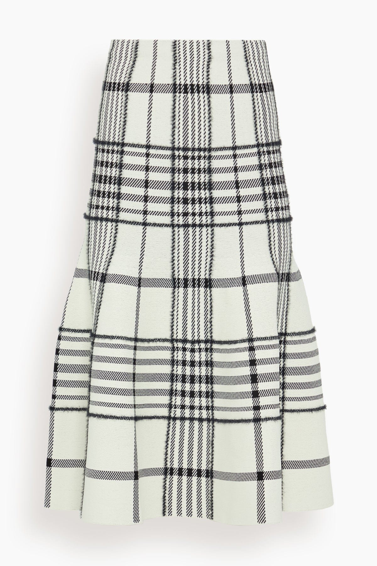 The Brandon Maxwell The Rory Flare Knit Skirt in Ivory Plaid is a sculpted knit skirt that reimagines heritage plaid with modern ease. Crafted in Italy from compact viscose jacquard, the plaid is softened by a subtle fuzzy finish, giving the silhouette texture and depth. Designed to sit just below the hip, the streamlined waist flows into a softly flared hem with natural movement. Slip-on in style, it balances polish with versatility and pairs effortlessly with the matching cardigan or everyday separates. - Midi length silhouette - Slip-on style - Streamlined waist with a softly flared hem - True to size - Intended to sit slightly low on the hip - 72% Viscose, 28% Polyamide - Made in Italy - Dry Clean