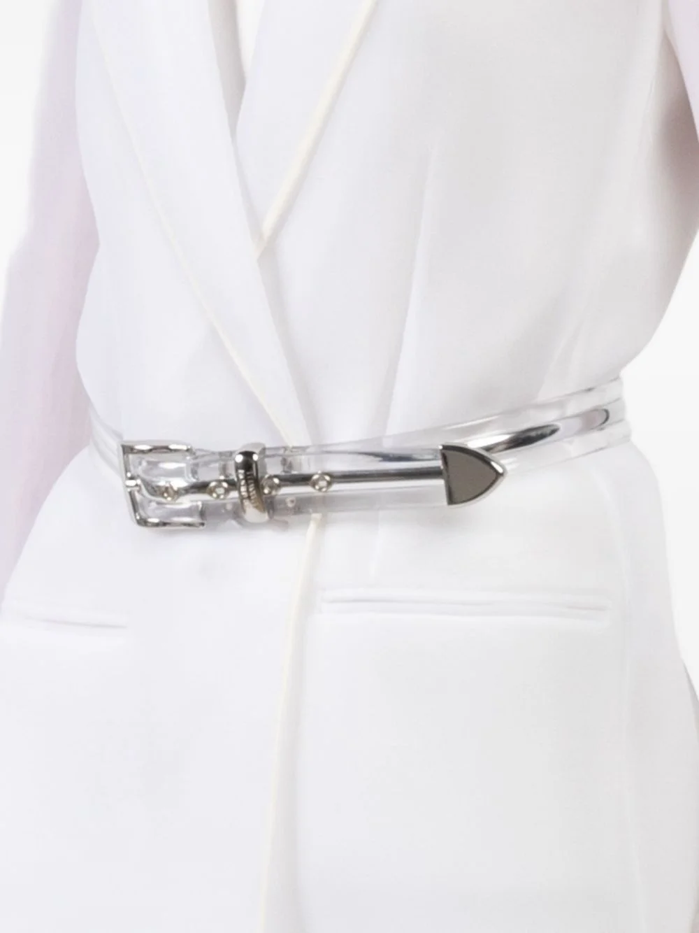 Transluscent buckle belt Highlights - Silver - Transparent band - Metallic buckle - Triangular buckle tip - Single-prong buckle Made in United States Composition Metal 100%, PVC 100%
