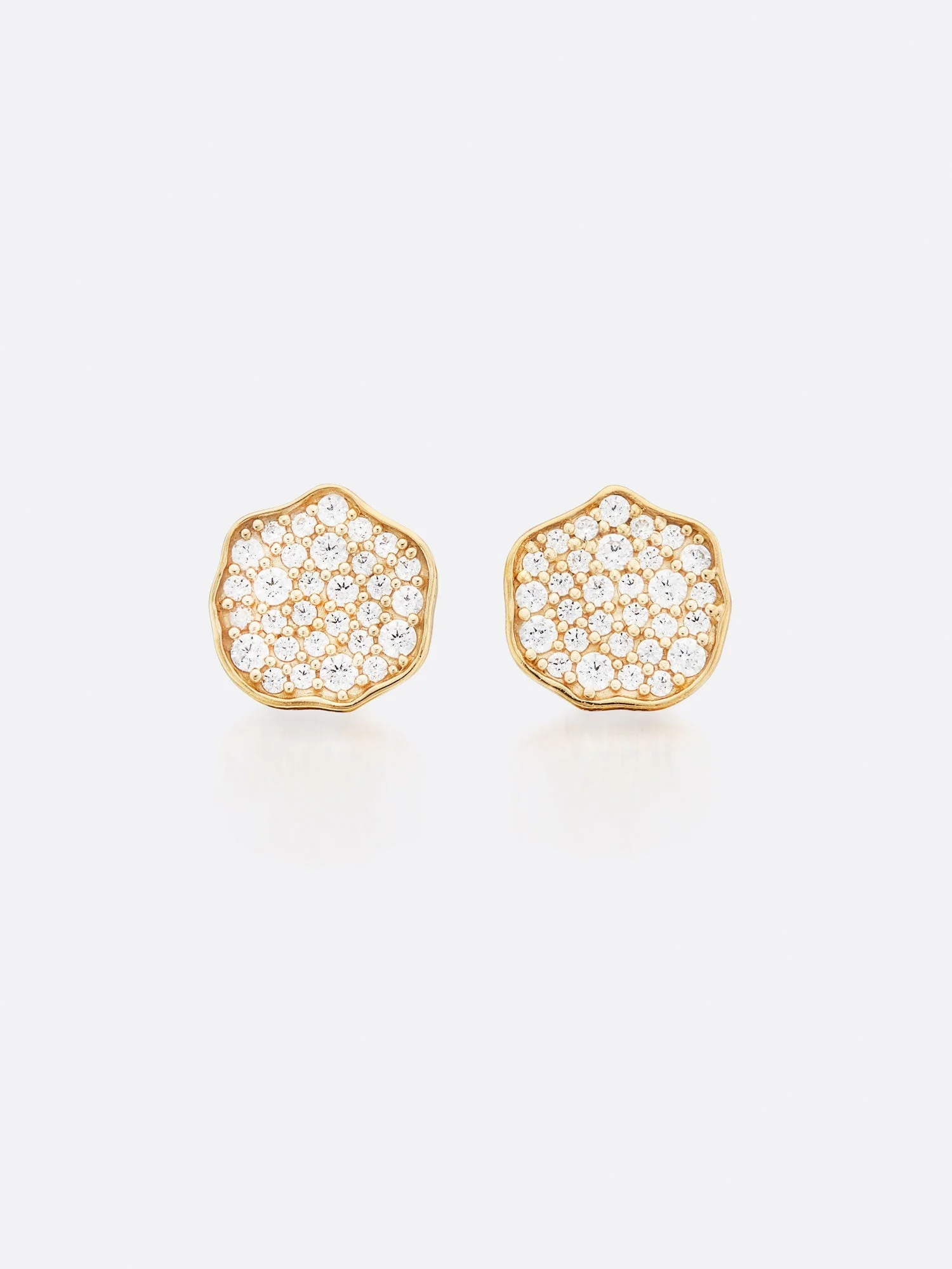 - Stud earrings - 18K Yellow Gold - Round Brilliant Pave handset, VS1-2 Clarity, H/I color Diamonds - 0.25 Carat total weight - Custom, asymmetrical round setting - Dimensions: 7.5mm x 1.5mm - Imported For the woman who loves to make an understated statement, our Petite Fleur Pave Diamond Mini Stud Earrings are pure magic. Inspired by patterns created in nature, these handset, asymmetrical 18K yellow gold, Pave Diamond earrings subtly sparkle as they catch the ever-changing light day-to-night. Exclusive to BrochuWalker.com and our Brochu Walker Atlanta, Carmel-by-the-Sea, Southampton & Westport Stores. Shop The Petite Fleur Collection