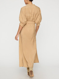 - Runs true to size - Tailored fit - Midi length - Fixed cross-front V neckline - Pre-styled short sleeves with single button cuff - Self-belt - Elasticized back waistband - Column skirt with side slits - On seam pockets - Length 55” - Italian fabric - 85% Modal/15% Polyester We reinvented our faux wrap dress silhouette with modern touches like a fixed cross-front V neckline and pre-styled short sleeves with functional button cuffs. Our Aurel Midi Dress has a sleek tailored fit, self-belt, on seam pockets and an elasticized back waistband for added comfort. The column skirt features side slits that add movement and a more relaxed sensibility. In a fluid, slightly textured Italian fabric, Aurel is the effortless, elegant dress that will take you from day-to-night.