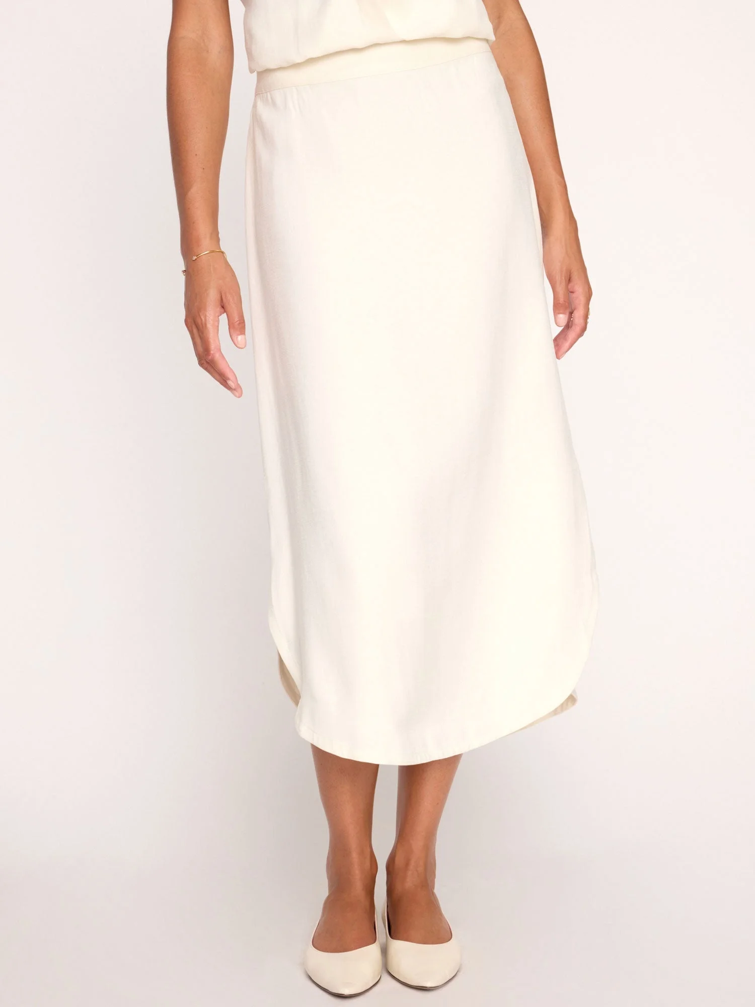 - Runs true to size - Relaxed fit - Midi length - Rounded hemline - Pull-on with an elasticized waistband - Unlined - Length 33” - Brushed Tencel - 93% Rayon/7% Polyester - Imported - Model is 5'9" and is wearing a size Small In a super soft, drapey, brushed Tencel fabric, our Cabas Skirt is everyday perfection. In a midi length with a sensual rounded hemline, this easy pull-on, elasticized waistband skirt is your new ‘throw-on’ with a touch of chic. We love it with our Nadel Top for a feminine, yet sporty head-to-toe look. Shop Skirts