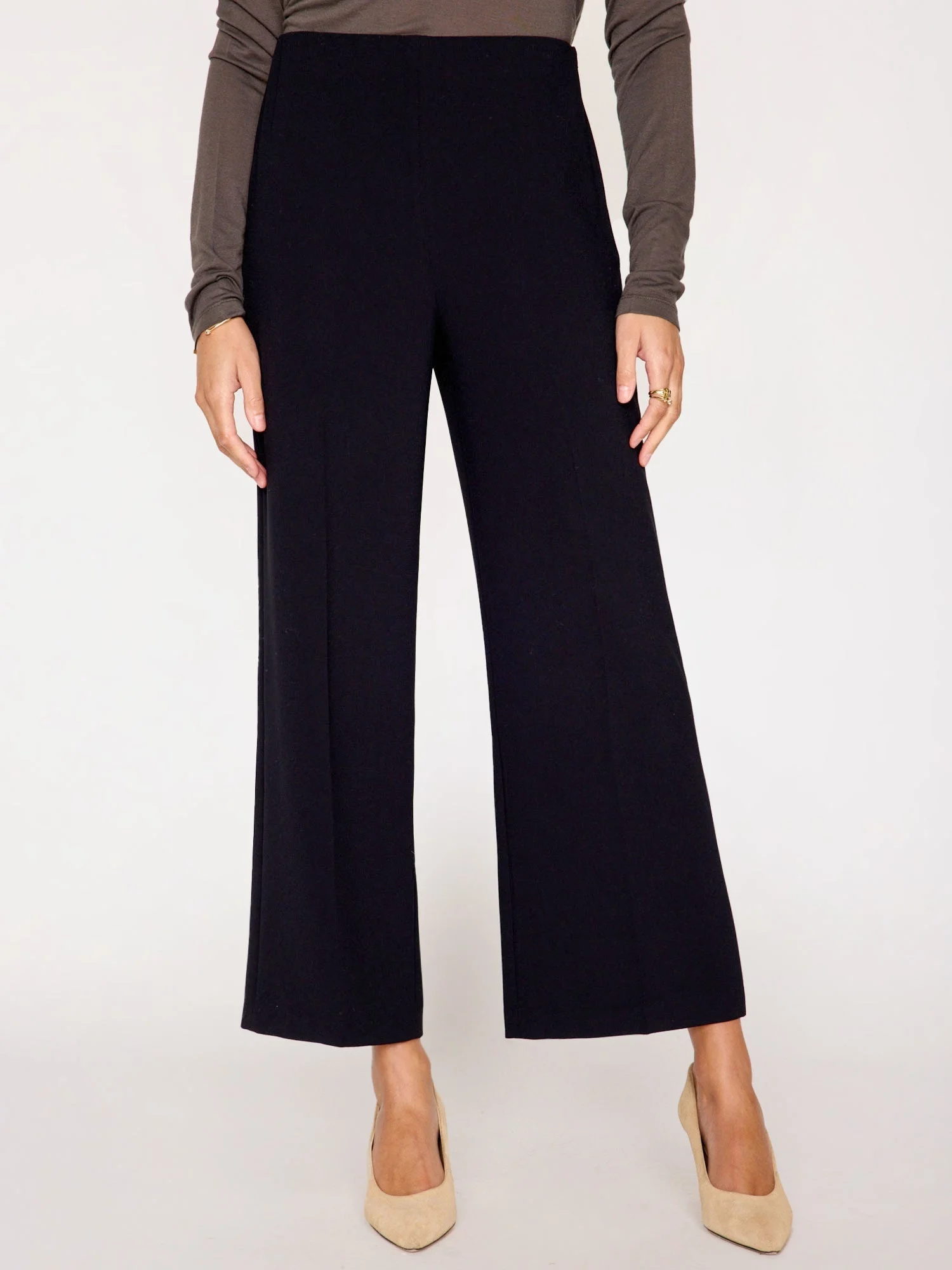 - Runs true to size - High Rise - Cropped, wide leg - Clean front - Concealed side zipper - Internal soft knit, elasticized waistband - Inseam 27” - 100% Polyester Crepe - Imported - Model is 5'9" and is wearing a size Small Our Carter Pant is an elevated must-have that is the epitome of casual, elegance. In a cropped, wide leg silhouette with a clean front, it has that feminine simplicity you love. We added a new internal, soft-knit, elasticized waistband for added comfort and a concealed side zipper for ease of wear. Carter is that every day pant that will take you everywhere.