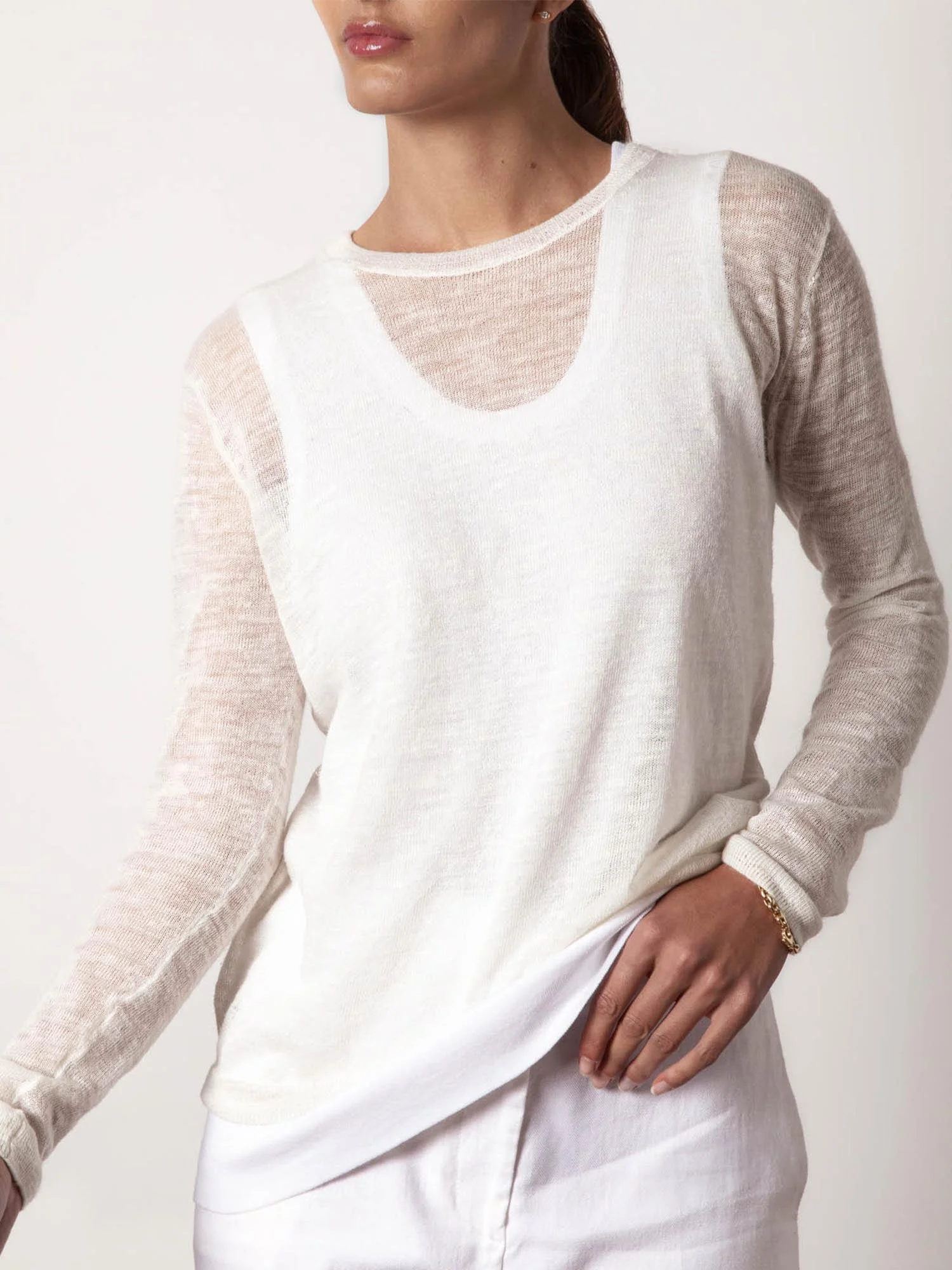 - Runs true to size - Crewneck overlayer, U-shape neckline underlayer - Semi-transparent long sleeves - Straight hem that can be moved around on the body to show as much or as little of the underlayer as desired. - Italian yarn - 55% Linen /45% Polyester Overlayer, 100% Cotton Underlayer - Imported The trend we started 11 years ago, pre-layered knitwear, has a new addition that is perfect for every season. Our Dafne Layered Crewneck features a slightly transparent, Italian fine gauze linen-blend overlayer and a cotton underlayer for a touch of casual sensuality and texture. The overlayer is a crewneck and the underlayer has a U-shaped neckline that adds to the peekaboo nature and the straight hem can be adjusted to show as much as the underlayer as desired. Who needs a basic tee shirt, when you can wear Dafne instead.