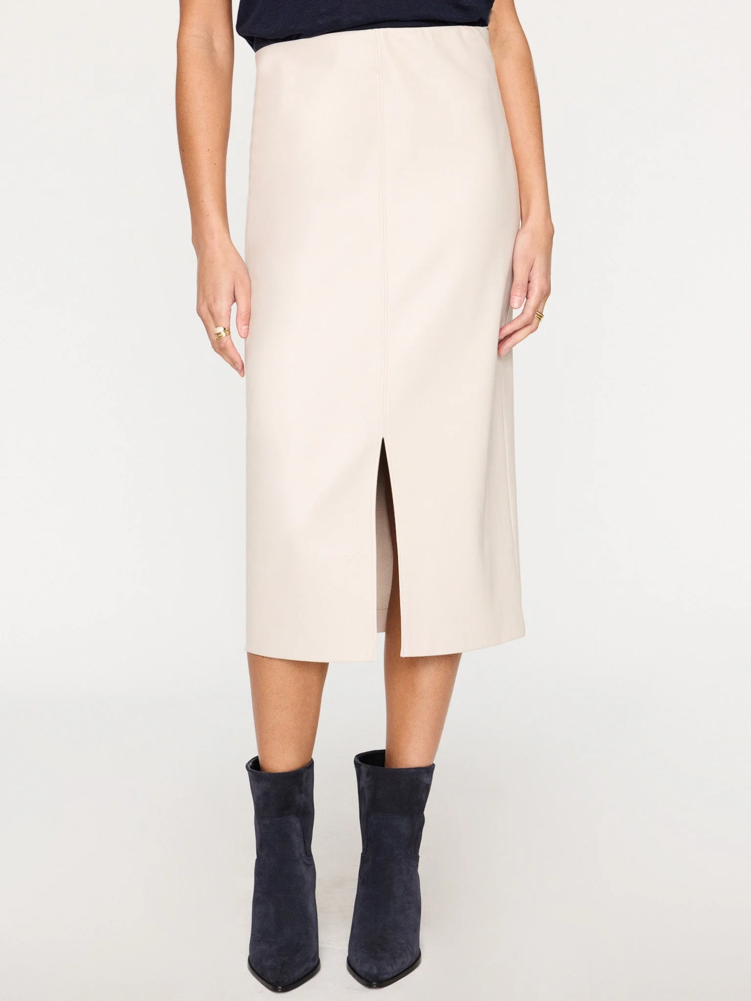 - Runs true to size - Midi length - Pencil skirt silhouette - Elasticized waistband with side zipper - Center front seam detail with open slit - Unlined - Size Small, 29 ½” length - Italian fabric - 50% Polyester/50% Polyurethane - Imported - Model is 5'9" and is wearing a size Small The perfect skirt to wear now, our Esme Skirt is simplicity at its finest. In a chic midi length, pencil skirt silhouette it features an elasticized waistband with side zipper making it as comfortable as it is feminine. Subtle details like a center front seam that culminates in a sensual open slit add intrigue. This soft Italian fabric moves gently as you move through your day. Shop Vegan Leather