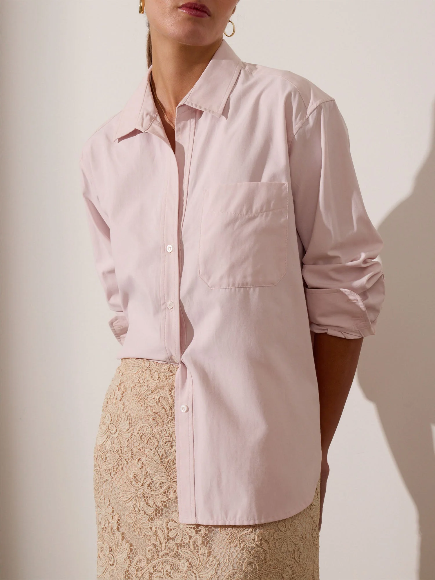 - Runs true to size - Slightly relaxed shape for an easy fit, so take your normal size - Button front placket - Long sleeves with button cuffs - Grosgrain detail on the cuffs and front placket - Locker loop at the back neck/yoke - 65% Cotton/35% Polyester - Length 27 ½” based on Size Small - Imported - Model is 5'9" and is wearing a size Small Our newest essential, our Everyday Shirt has that classic American vibe with a subtle Brochu Walker twist. In a relaxed fit, perfect for day or night, it features special details like subtle grosgrain trim on the cuffs and placket and a locker loop on the back neck/yoke. While it has a traditional collar and button placket, this shirt is anything but basic.