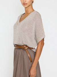 - Size down for a slimmer fit - Relaxed fit - V-neck with ribbed trim - Short sleeves - Straight, ribbed hem - 21 ½” based on a size small - Italian, metallic, chainette yarn - 85% FSC Viscose/11% Metallized Polyester/4% Polyamide - Imported Our dress-up, dress-down tee, Gaia is made from a beautiful, Italian, metallic, chainette yarn that shimmers as it catches the light. This relaxed fit v neck features short sleeves with a ribbed neckline and hem. Designed to be worn day-into-night, our Gaia Tee is the ultimate in elegant versatility. Part of our ‘Kinder To The Environment’ collection, FSC viscose is sourced through sustainable forestry management.