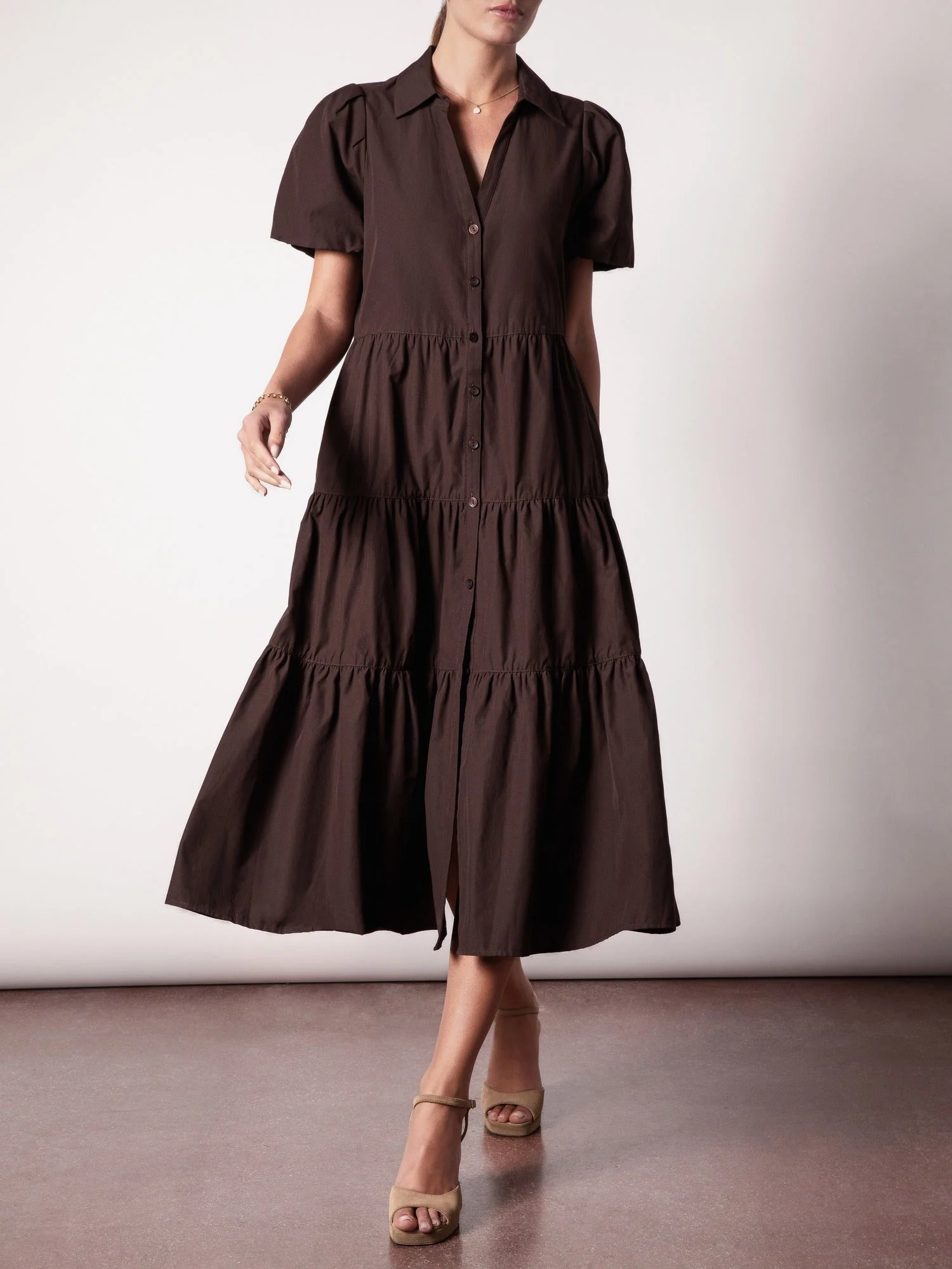 - Runs true to size - Relaxed fit - Length- XS: 48", S: 49 ", M: 50", L: 51", XL: 52" - Chest Measurements- XS: 34 ½” – 35 ½”, S: 36 ½” – 37 ½”, M: 38 ½” – 39 ½”, L: 41 ½ - 42 ½”, XL: 44 ½” – 45 ½” - Tiered skirt - V-neckline - Puff sleeves - Button front placket - Washed cotton finish - 65% Polyester/35% Cotton - Imported - Model is 5'9" and is wearing a size Small "Easy, Breezy Perfection" — InStyle.com "Brochu Walker’s tiered shirt dress construction is endlessly flattering…” — Forbes The Havana, the dress we are known for, is the iconic Brochu Walker essential. In a new, limited edition rich brown hue, Java – this sophisticated, signature dress silhouette is assured to take you from season to season. A tiered skirt and puff sleeves give a definitive feminine appeal, while the collared v-neck and button front placket make it as chic as it is versatile. Designed to be worn belted or loose and flowing, it is the one piece that can take you everywhere. Shop The Havana Collection