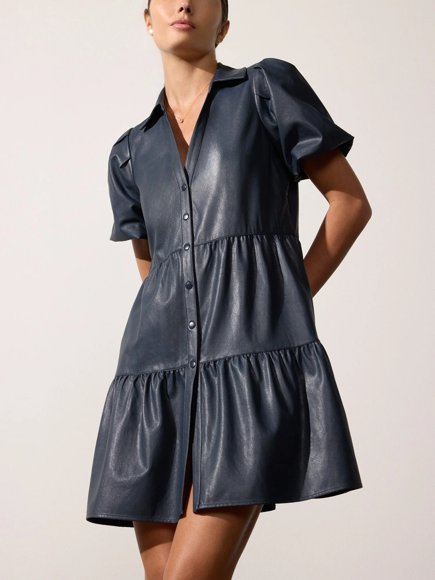 - Runs true to size - Relaxed fit - Mini length, 36" on size Small - Chest Measurements: XS: 36” / S: 37 ½” / M: 39 ½” / L: 42 ½” - Tiered skirt - V-neckline - Button front placket - Puff sleeves - On seam pockets - Stretch Vegan Leather - 87% Polyurethane/13% Spandex - Imported - Model is 5'9" and is wearing a size Small Our most loved Havana Mini Dress is now available in our sought-after vegan leather. Like its big sister, a tiered skirt and puff sleeves give a definitive feminine appeal, while the collared V-neck and button front placket, make it as chic as it is versatile. We added on seam pockets for added functionality making it perfect for every day, everywhere. Shop The Havana Collection