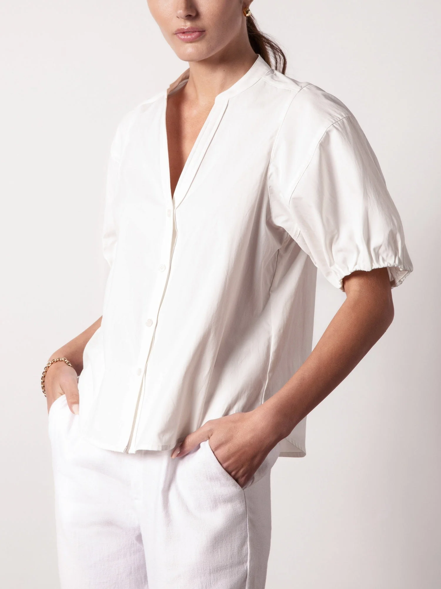 - Runs true to size - Button front - Stand collar - V-neckline - 65% Polyester, 35% Cotton - Imported - Model is 5'9" and is wearing a size Small Offered in luxe neutral, the Hollis Shirt features a stand collar and button front placket with top stitching at both sides for a special edge detailing. A perfect mix of European design with a nostalgic East coast ease, the sleeves feature a mid-bicep curved seam and gathers into self- binding with a loose fit to create an easy style with a sophisticated flair.