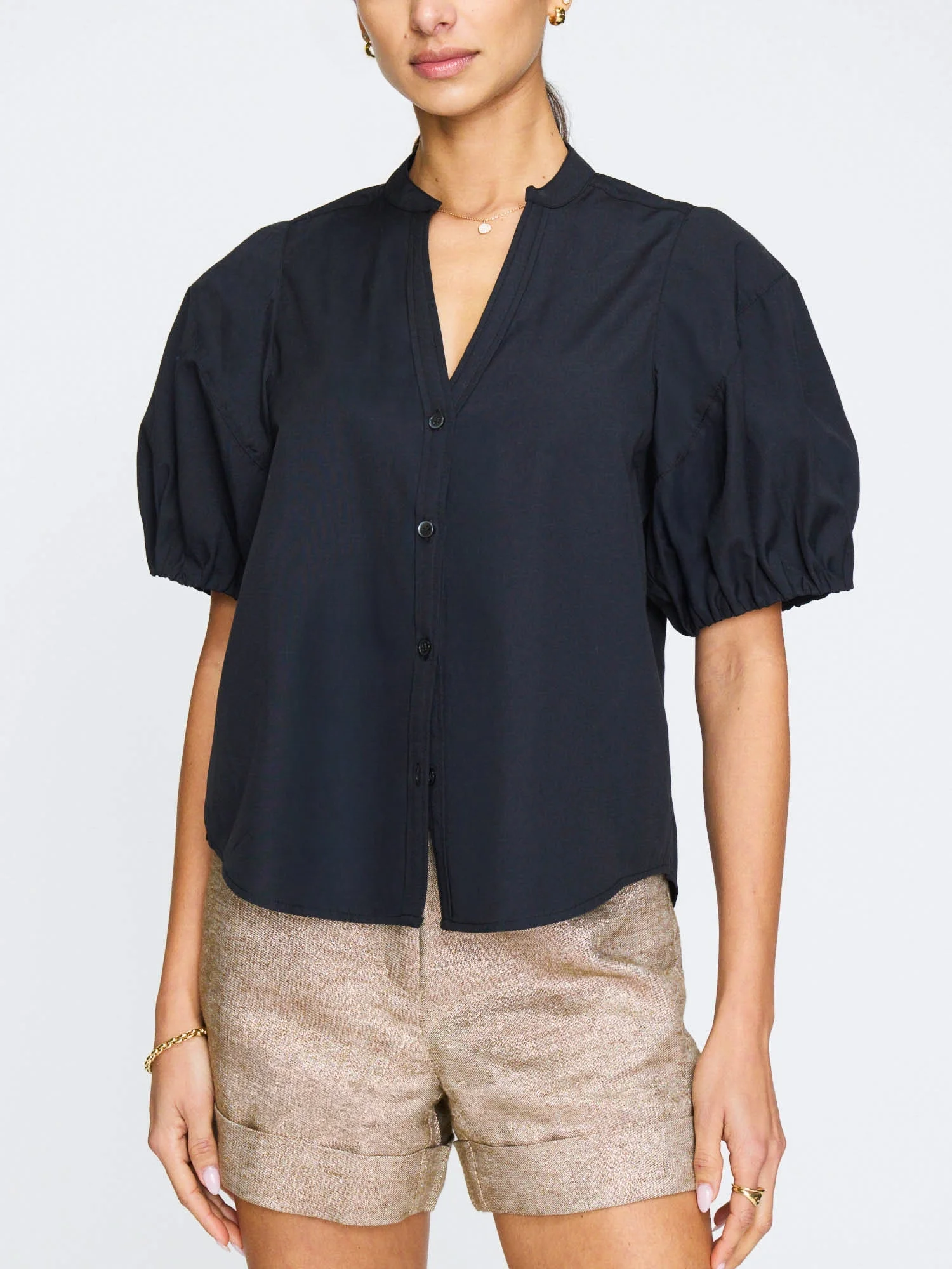 - Runs true to size - Button front - Stand collar - V-neckline - 65% Polyester, 35% Cotton - Imported - Model is 5'9" and is wearing a size Small Offered in rich black onyx, the Hollis Shirt features a stand collar and button front placket with top stitching at both sides for a special edge detailing. A perfect mix of European design with a nostalgic East coast ease, the sleeves feature a mid-bicep curved seam and gathers into self- binding with a loose fit to create an easy style with a sophisticated flair.