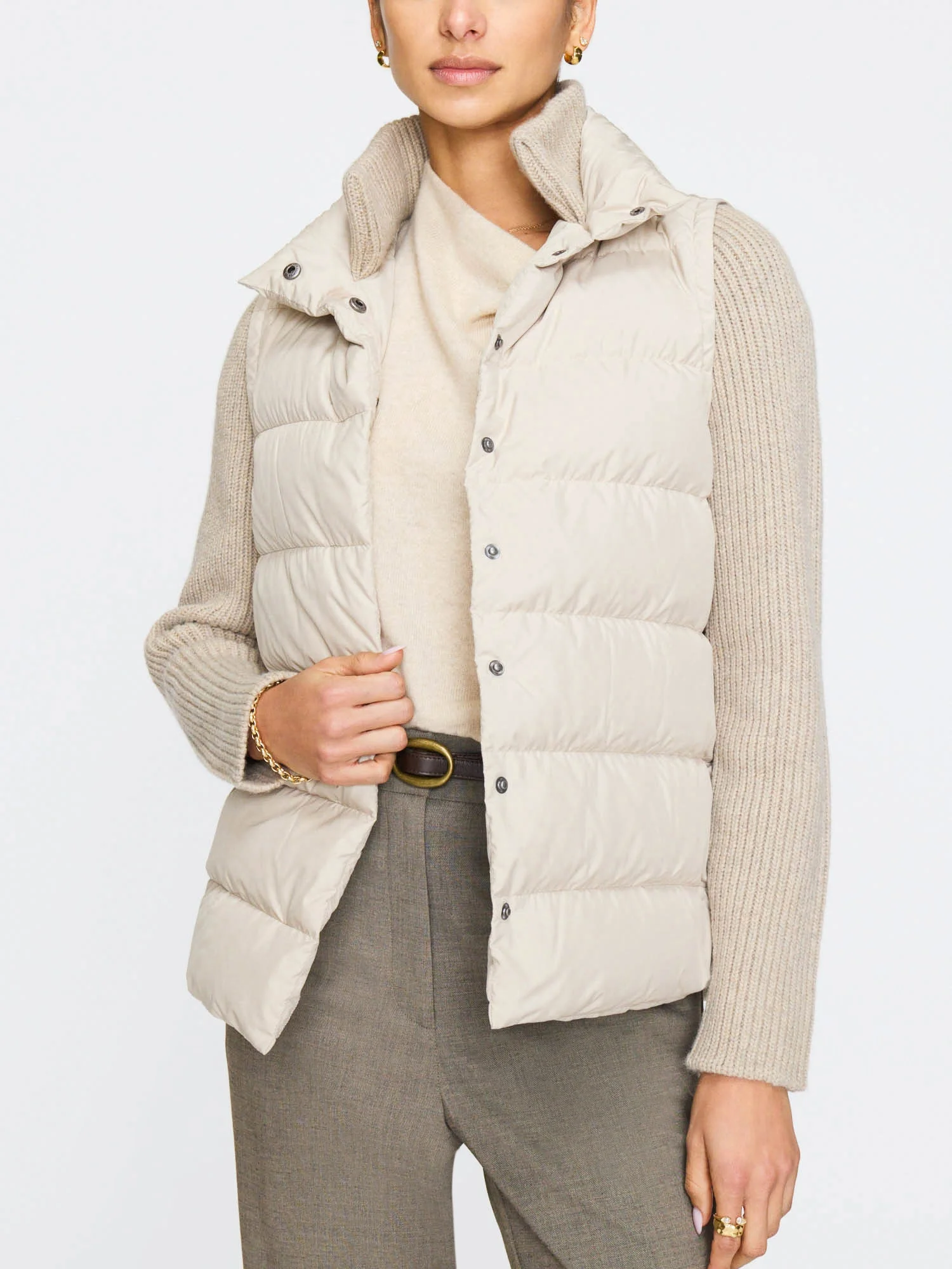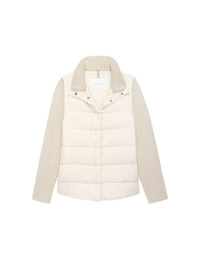 - Runs true to size - Tailored fit - High stand collar - Snap hidden front closure with grosgrain detail - Side seam front pockets - Length 26 ½” based on Size Small - Ribbed sleeves and collar - 100% Nylon with Down Fill, 70% Wool 30% Nylon - Imported - Model is 5'9" and is wearing a size Small An update to our beloved Anders Vest, the Iris Jacket blends structured tailoring with layered elegance. Half-cardigan knit sleeves and collar add a modern touch.
