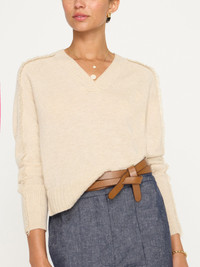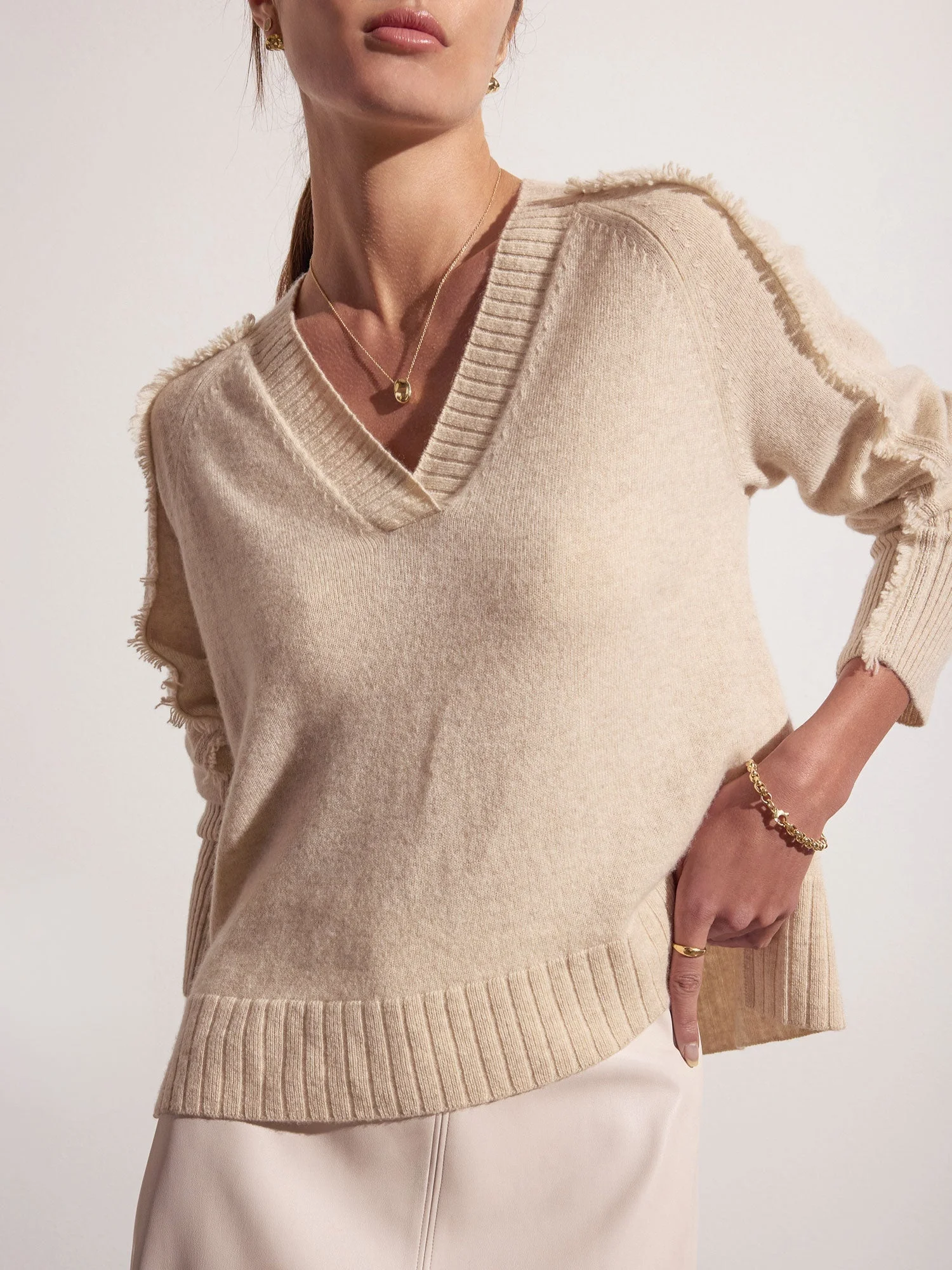 - Runs true to size - Tailored fit - V neck - Self-fringe trim along the front of the sleeves - Raglan long sleeves - Ribbed trim neck, cuffs and hem - Forward side seams with slits at the side hem - 100% Cashmere - Imported - Model is 5'9" and is wearing a size Small Inspired by our most-loved Jolie Turtleneck, your new every day, everywhere sweater is here. Self-fringe trim detail adds a touch of Brochu Walker drama to the front of the long raglan sleeves, while forward side seams with slits at the hem allows for comfort and movement. In luxurious 100% cashmere, accented by ribbed cuffs, neckline and hem, this v neck sweater is the one you will want to get cozy every day. Part of our ‘Kinder To The Environment’ collection, it incorporates RWS-certified, traceable yarn which means it adheres to stringent animal welfare standards.