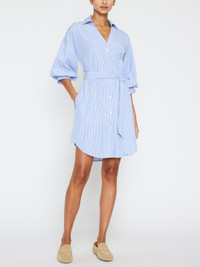 - Runs true to size - Relaxed fit - Mini length - Collared v-neckline - Button front - Elbow length sleeves with a blouson (pushed-up) effect - Scooped, shirttail hem - Self, removable belt - 38” body length size Small - Unlined - 65% Polyester/35% Cotton - Imported - Model is 5'9" and is wearing a size Small Destined to become your new favorite dress, our Kate Belted Shirtdress is the one you will gravitate towards day in and day out. In a mini-length, this perfect little shift dress, can be worn with its self-belt or worn loose and relaxed for those days you want to look easy-breezy. As always, we like to infuse femininity into our designs, so added touches like blouson sleeves with a pushed-up effect and an exaggerated or scooped, shirttail hem make Kate the perfect example of effortless sensuality. Shop The Kate Collection