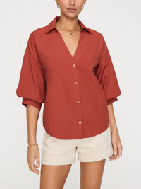 - Runs true to size - Relaxed fit, take a size down if you prefer a closer fit - Length: 25 1/2", Chest: 41" on size Small - Collared v-neckline - Button front - Elbow length sleeves with a blouson (pushed-up) effect - Button cuff - Scooped, shirttail hem - 65% Polyester/35% Cotton - Imported - Model is 5'9" and is wearing a size Small Inspired by our most-loved Kate Belted Shirtdress, our Kate Shirt has that same easy sensibility that will make you gravitate towards it day in and day out. This perfect shirt can be worn tucked in or loose and relaxed for those days you want to look easy-breezy. As always, we like to infuse femininity into our designs, so added touches like blouson, button cuff sleeves with a pushed-up effect and a scooped, shirttail hem make Kate the perfect example of effortless sensuality. Shop The Kate Collection