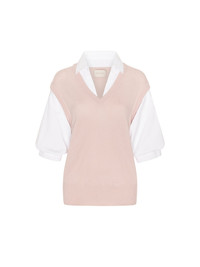 - Runs true to size - Relaxed fit - V neck vest overlayer with pre-layered shirt underlayer - Elbow length sleeves with a blouson (pushed-up) effect - Button cuffs - Signature center back seam detail - Ribbed neckline, armholes trims and hem - 70% Wool/30% Cashmere Overlayer/Cotton Blend Underlayer - Imported - Model is 5'9" and is wearing a size Small Our Kate Shirt Looker Sweater combines everything you love about our pre-layered knitwear and our feminine shirts. With a pre-styled v neck vest overlayer and a dramatic, elbow-length, blouson sleeve it is wear-now, wear-forever perfection. Relaxed, sensual, effortless, it is the style that makes an everyday statement. Shop The Kate Collection
