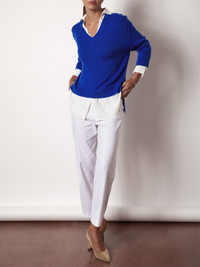 - Oversized (take a size down if you prefer a closer fit) - V neck - Dropped shoulders - Curved high low hem - 70% Wool/30% Cashmere with 100% Polyester Georgette partial shirting underlayer - Imported - Dry clean recommended Our bestselling sweater for over 10 years, The Looker Layered V-Neck makes getting dressed and looking effortlessly chic so easy. A luxurious, cashmere blend sweater is pre-layered over a recycled georgette underlayer which creates the illusion of two pieces in one. The shirting collar, cuffs and hem are attached on the inside of the knit layer, so The Looker remains lightweight and trans seasonal, while the slightly oversized fit makes it cozy. The mixed media sweater that completes any look, The Looker is the one piece you will want to wear every day, everywhere. Part of our Kinder To The Environment Collection, Callie includes a recycled georgette underlayer to reduce its carbon footprint.