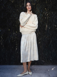 - Runs true to size - Relaxed fit - Stitched-down pleats - Internal elasticized waistband - Side zipper with hook and bar closure - Length 31” - Fully lined - Pearlized Liquid Satin - 100% Polyester - Imported - Model is 5'9" and is wearing a size Small In a dramatic, pearlized liquid satin, our Neve Skirt is feminine perfection. This skirt features a relaxed silhouette that is complemented by stitched-down pleats that release to create a full skirt. Modern yet always sensual, Neve has an internal elasticized waistband with an exposed raw edge detailing above for added comfort and a full lining for a demure sensibility.