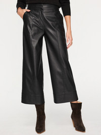 - Runs true to size - Tailored fit through the waistline - Wide leg - Cropped - 25" inseam - Fly front with elasticized back waistband - Stitch detail on the front of the legs - Deep stitch detail at the pant cuffs - Two front slant pockets - Two back welt pockets - Vegan leather - 87% Polyester/13% Polyurethane - Imported The newest addition to our sought-after vegan leather collection, our Odele Cropped Pant is as cool as it is chic. Tailored through the waistline, with wide legs that culminate in deep-stitch-detail cuffs, these vegan leather pants add a definitive modern touch. An elasticized-back, pull-on waistband adds comfort, while front slant pockets and back welt pockets add function…sophisticated ease that you can’t live without.