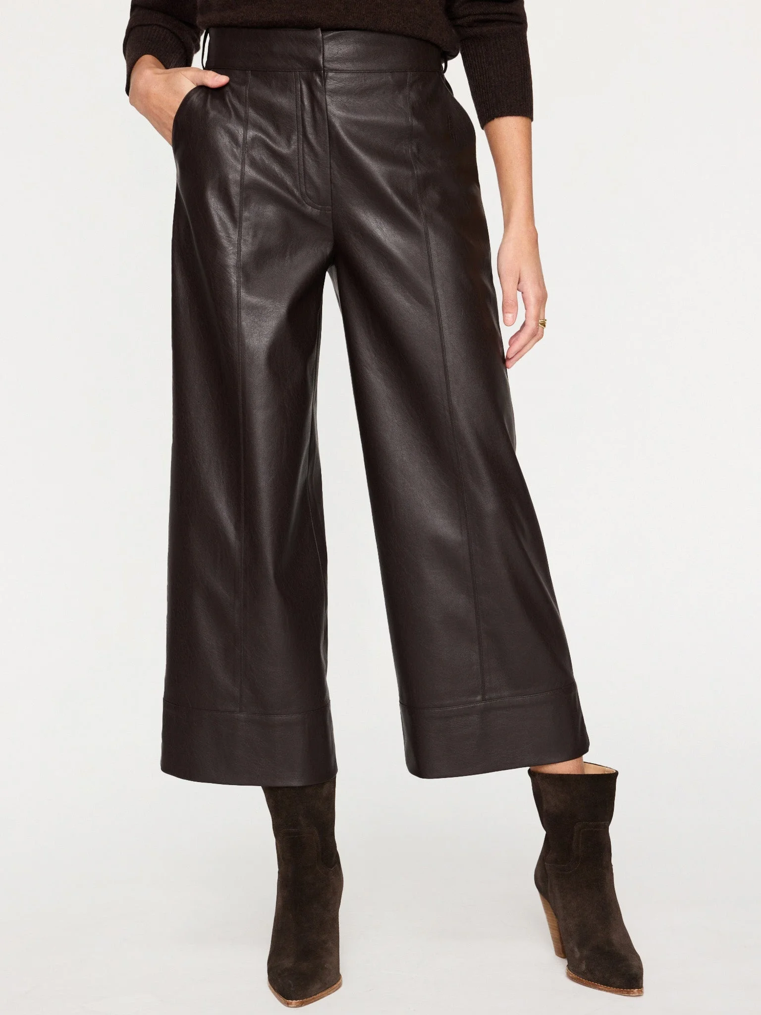 - Runs true to size - Tailored fit through the waistline - Wide leg - Cropped - 25" inseam - Fly front with elasticized back waistband - Stitch detail on the front of the legs - Deep stitch detail at the pant cuffs - Two front slant pockets - Two back welt pockets - Vegan leather - 87% Polyester/13% Polyurethane - Imported The newest addition to our sought-after vegan leather collection, our Odele Cropped Pant is as cool as it is chic. Tailored through the waistline, with wide legs that culminate in deep-stitch-detail cuffs, these vegan leather pants add a definitive modern touch. An elasticized-back, pull-on waistband adds comfort, while front slant pockets and back welt pockets add function…sophisticated east that you can’t live without.