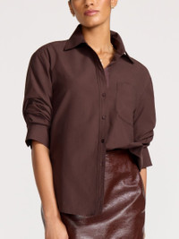 - Runs true to size - Slightly relaxed shape for an easy fit - Button front placket - Pre-styled scrunched sleeves - Grosgrain detail on the front placket - Locker loop at the back neck/yoke - 65% Polyester/35% Cotton - Length 27 ½” on Size Small - Imported - Model is 5'9" and is wearing a size Small The newest addition to our essential Shirt Collection, our Pia Shirt has the same silhouette as our bestselling Everyday Shirt, now featuring a pre-styled scrunched sleeve giving it a more sensual sensibility than our most-loved cotton shirts. In a relaxed fit, that makes it effortless, this button front shirt features special details like subtle grosgrain trim on the placket and a locker loop on the back yoke.
